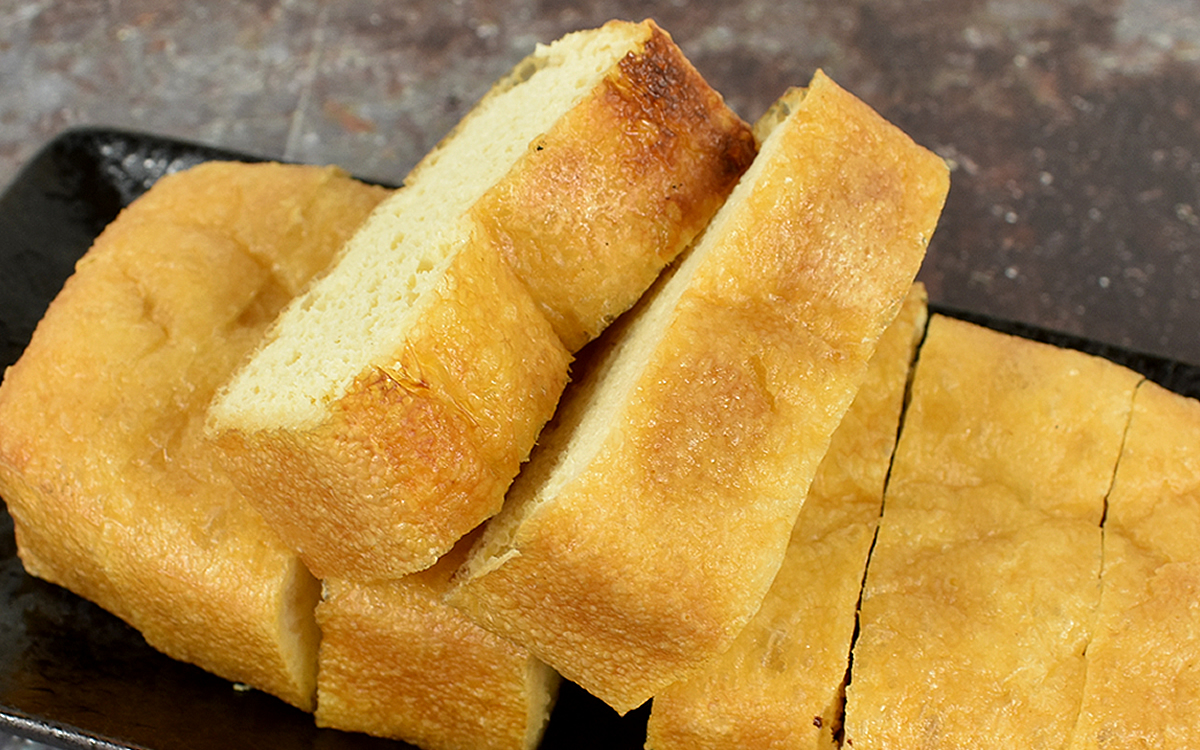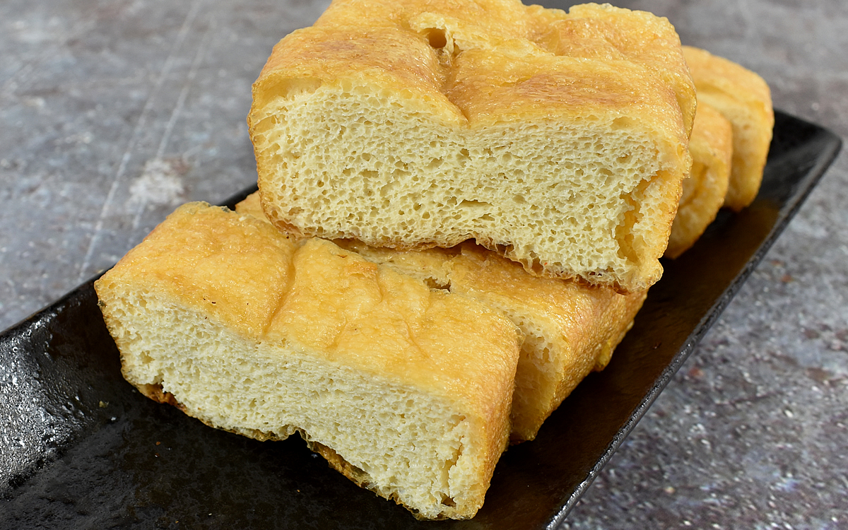 同商品を販売する「ぽっぽ」は、新潟県の長岡市栃尾に存在するまめ工房。栃尾では油揚げを「あぶらげ」と呼んで親しんでおり、なんと専門的に取り扱っている店舗が15以上もあるそうです。中でも、素材にこだわって作り上げる油揚げで有名なのが「ぽっぽ」。冷凍で届いた「栃尾の油揚げ」を電子レンジで数分温め、さらに約3~5分焼くとこうばしい香りが漂いました。