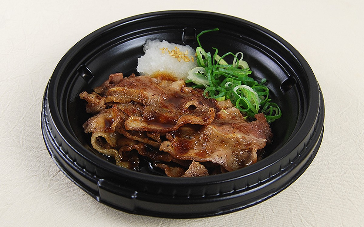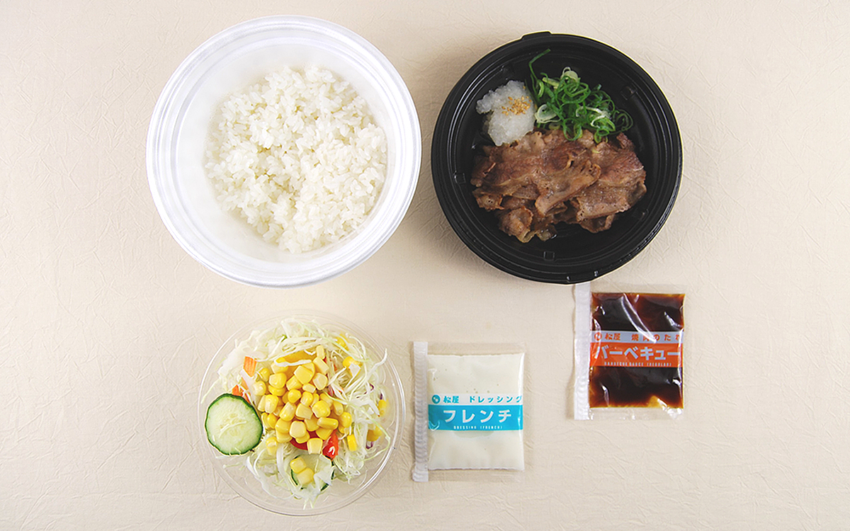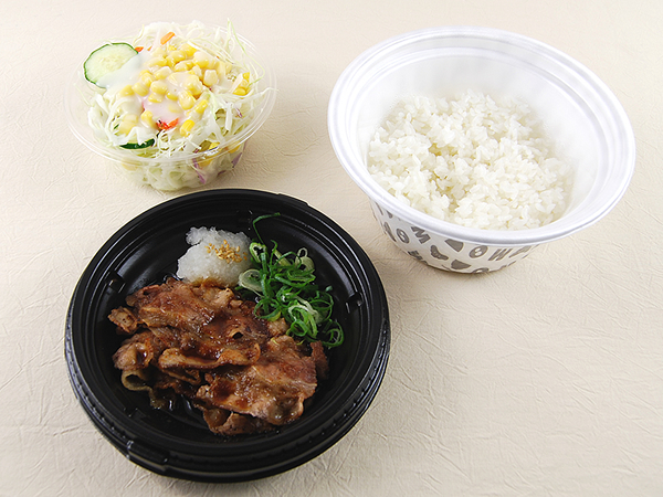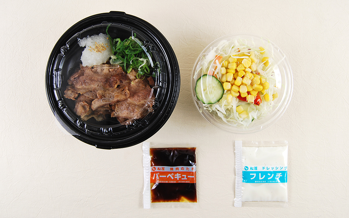 同商品は大根おろしとネギが添えられた牛焼肉に、ご飯と生野菜のサラダがセットになっている定食メニュー。テイクアウトで購入すると「バーベキュー」「ポン酢タレ」「焼肉のタレ甘口(カルビソース)」の3種類からタレを選ぶことができ、今回は「バーベキュー」をチョイスしました。