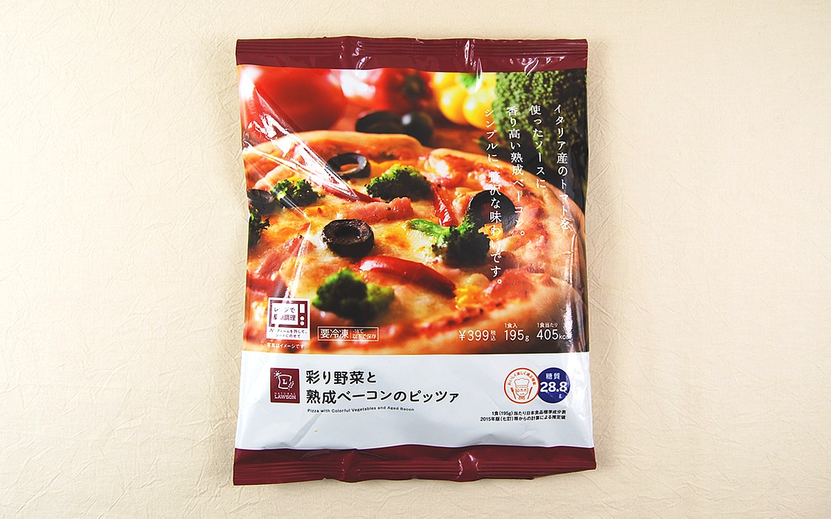 デリバリーで頼まなくても、スーパーやコンビニで手軽に買える冷凍ピザ。電子レンジやオーブンで温めるだけで、好きなときにアツアツのピザが食べられるのはうれしいですよね。一方でピザといえば高カロリーなイメージもあり、「ダイエット中だからピザを食べるのに罪悪感がある…」という人も多いのでは? そこで今回はローソンの「彩り野菜と熟成ベーコンのピッツァ」(399円/税込)をセレクト。本格的な味わいが楽しめる上に、野菜たっぷりで糖質を抑えた一品です。