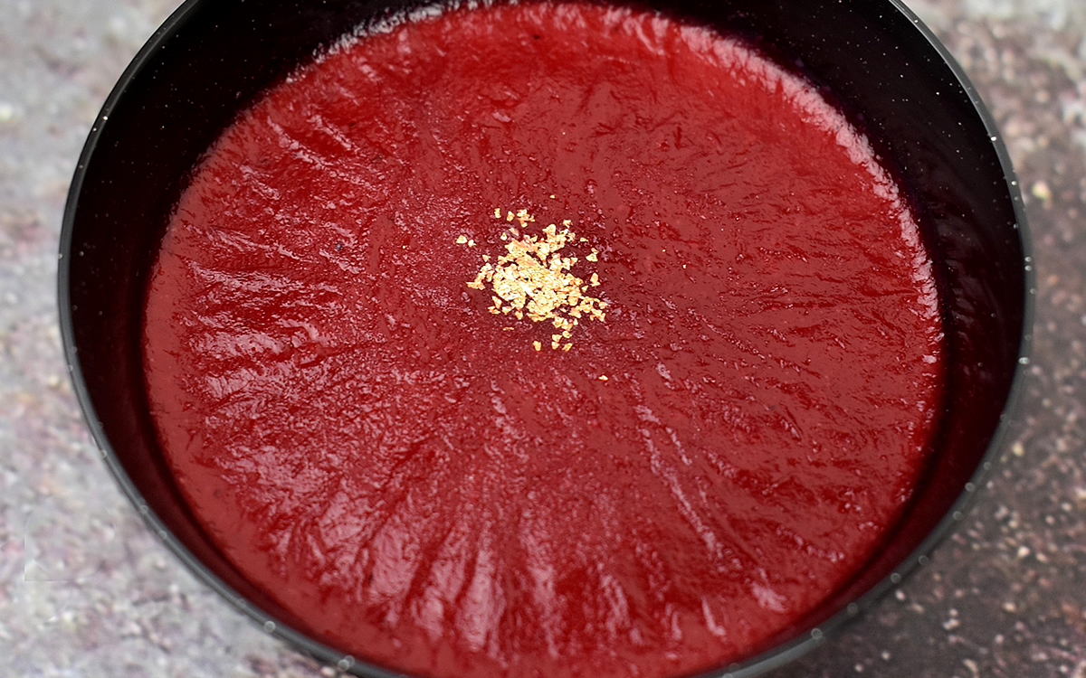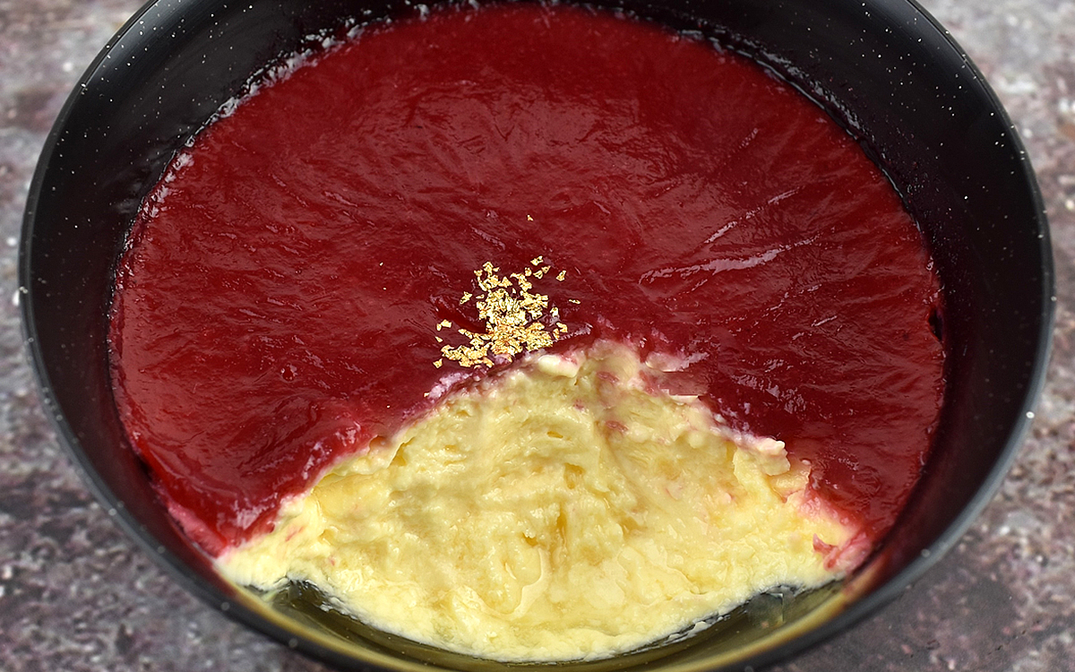 生クリームと牛乳をベースに作られたプリンの上に、ラズベリーゼリーが流しこまれた同商品。ゼリーの深い赤紫色と金箔のトッピングが印象的で、高級感のあるビジュアルも魅力的ですよね。