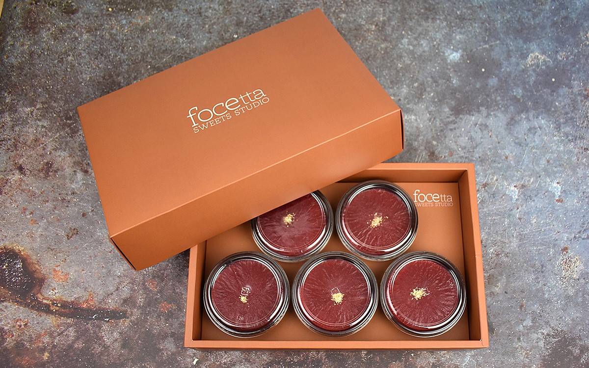 大阪市に店舗を構え、ケーキや焼き菓子の製造・販売を行っているスイーツ工房「focetta」。特に高い人気を誇る「天空のプリン」シリーズは、日本テレビ系列で放送中の「ヒルナンデス!」でも紹介された看板商品です。なかでも「天空のプリン漿果(ベリー)」は甘酸っぱいラズベリーの風味を楽しめる人気フレーバーの1つ。5個入りセットを購入したところ、贈り物にもピッタリなギフトBOXに入って届きました。