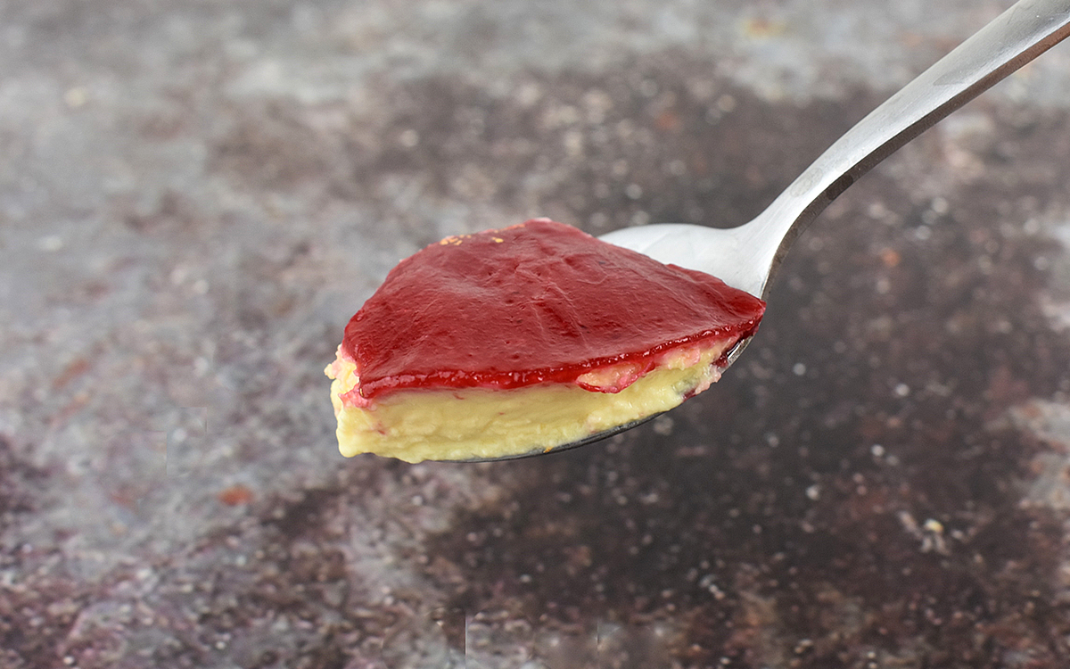 まず、表面のゼリーをすくって口に運んでみたところ、ラズベリーの爽やかな酸味が口いっぱいに広がりました。いちごやブルーベリーとも違う、独特の香り高い風味が絶品。上品で大人っぽい味わいがたまりません。