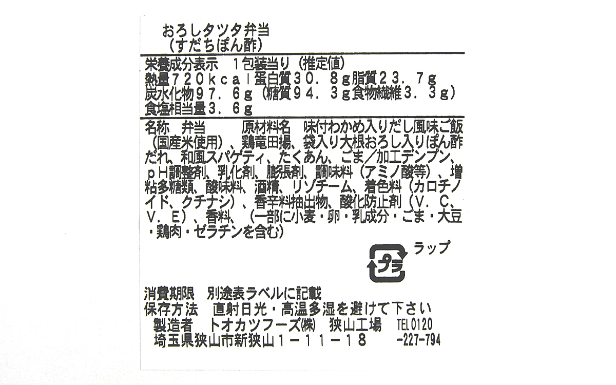 揚げ物が入ったコンビニ弁当は定番メニューの1つですが、ボリュームが多かったり味が濃かったりして食べている途中で飽きてしまうことも。そこで今回は、“すだちおろしぽん酢”が効いたファミリーマートの「おろしタツタ弁当(すだちぽん酢)」(498円/税込)をセレクトしました。ネット上でも「揚げ物なのにサッパリしていて全然飽きない!」という声があがっている人気の一品です。