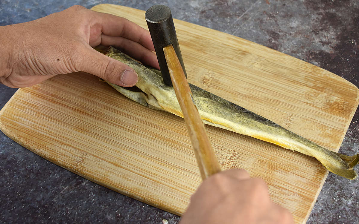 まずは皮をむきやすくするため、カナヅチで叩いてください。何度か叩いていると、皮と実の間に隙間が。天日干しこまいは焼かずに食べることがオススメされているため、皮をむいたらそのままいただきます。