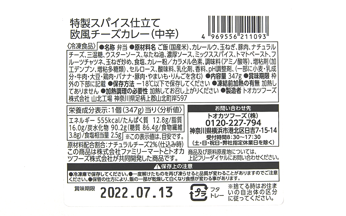 コンビニ弁当やレトルト食品で定番メニューの1つであるカレー。私自身も無性に食べたくなるときがありますが、面倒な調理をせずパパっと食べられるとうれしいですよね。そこで今回は、ファミリーマートから発売されている冷凍食品「特製スパイス仕立て 欧風チーズカレー(中辛)」(330円/税込)をセレクト。長期保存できるため、冷凍庫に常備しておくのにピッタリな商品です。