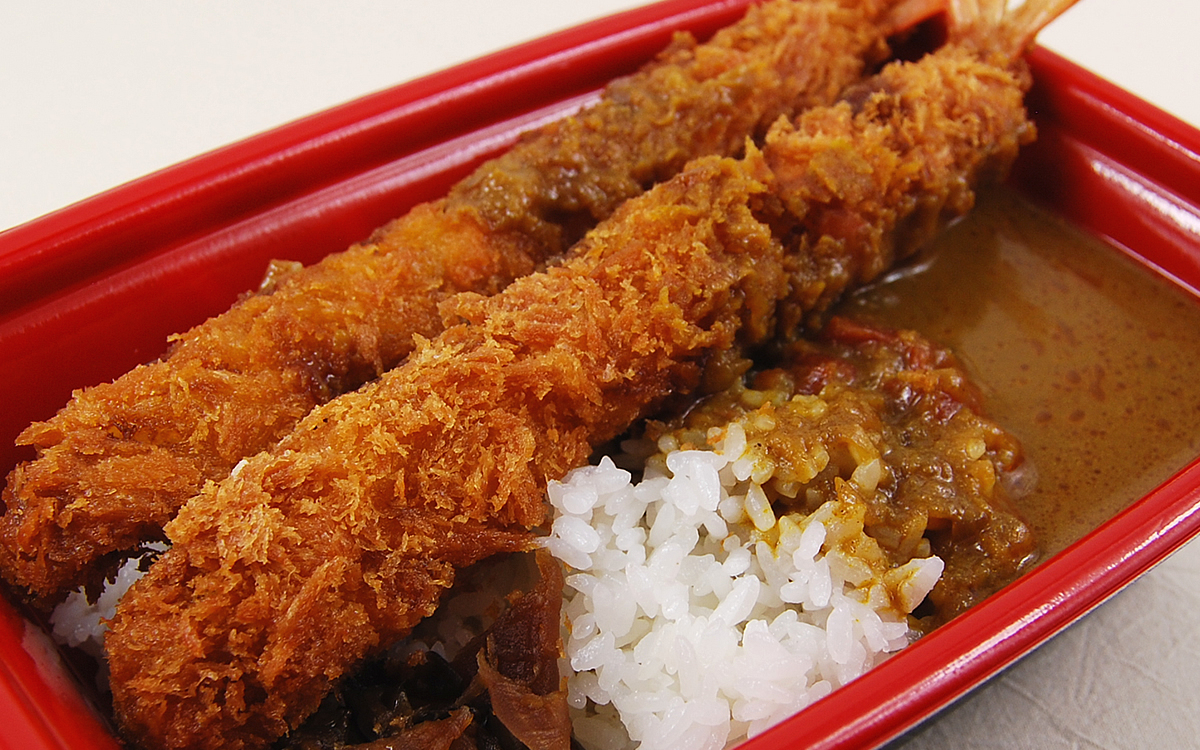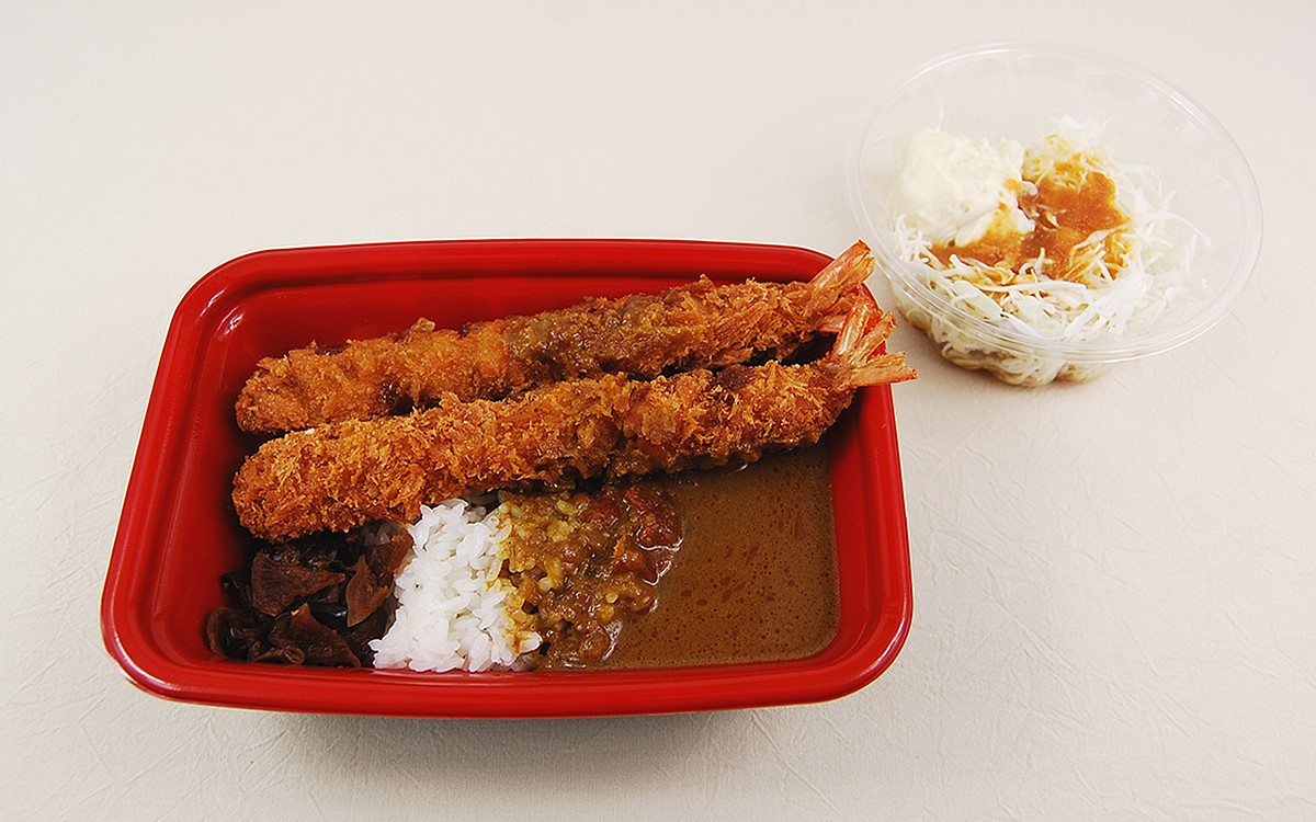 容器からはみ出しそうなほど大きな海老フライは、サクっジュワっとした衣にプリプリ食感の海老が包まれていました。ルーがどろっとしすぎていないのでフライの食感を存分に楽しむことが可能。カレーの濃厚な味わいにも負けず劣らず旨味が強く、海老フライ好きにはたまりません。