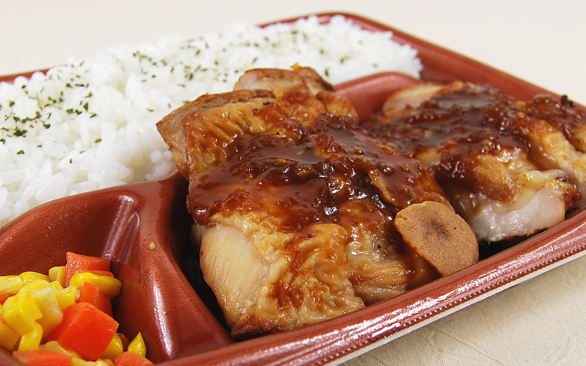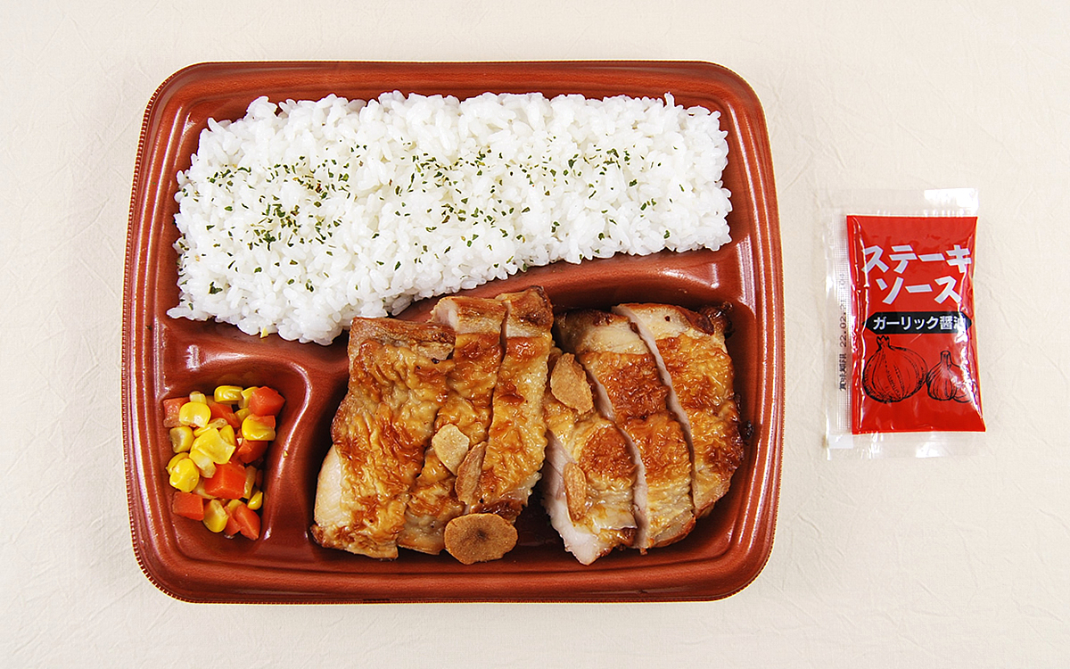 6切れにカットされたチキンステーキとご飯、付け合わせにコーンと人参のバター炒めが盛りつけられた同商品。ガーリック醤油のステーキソースは別で付属しており、食べる前にチキンにたっぷりとかけてからいただきましょう。