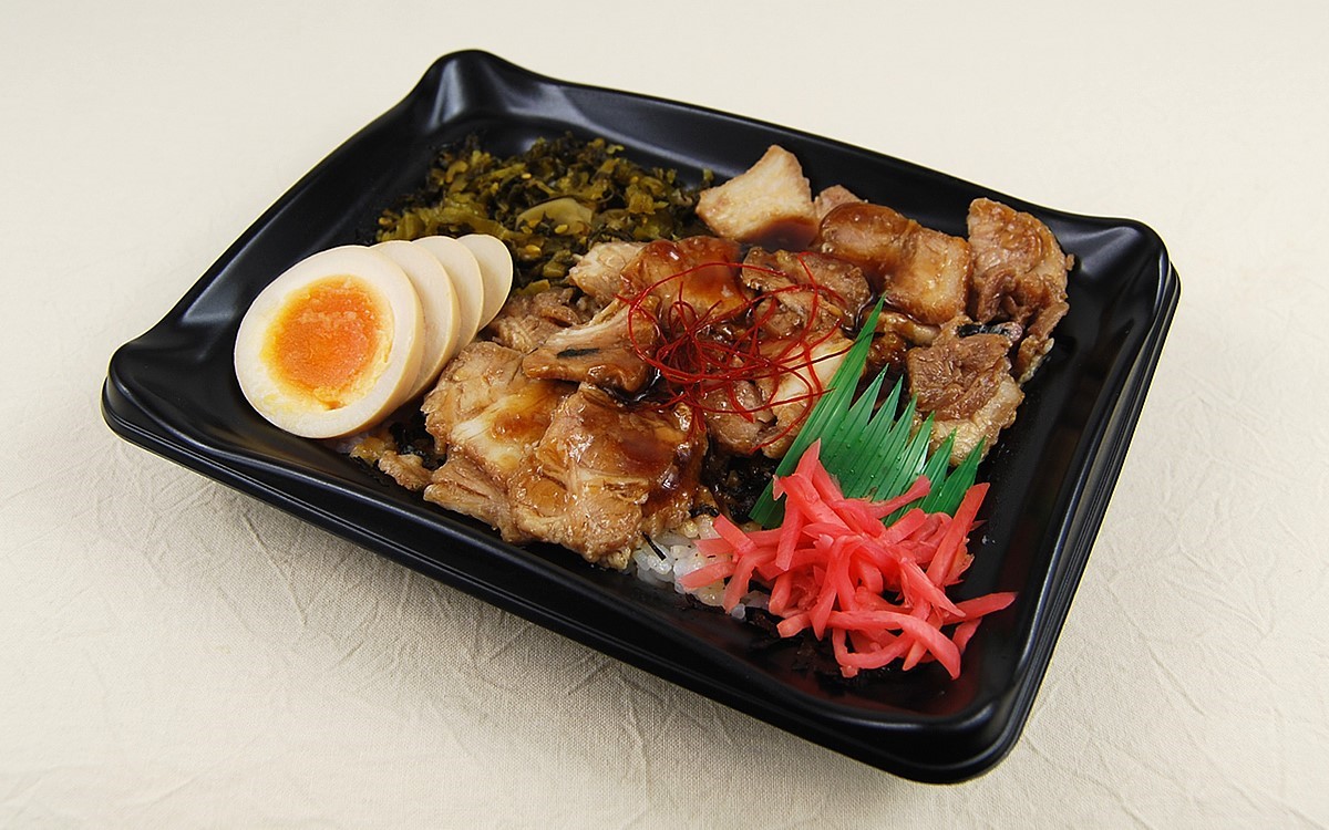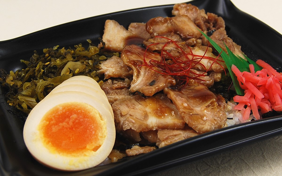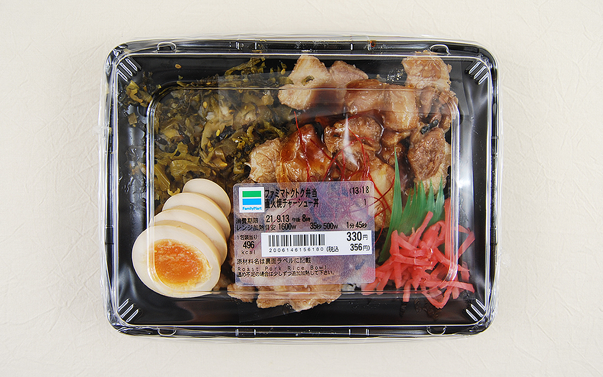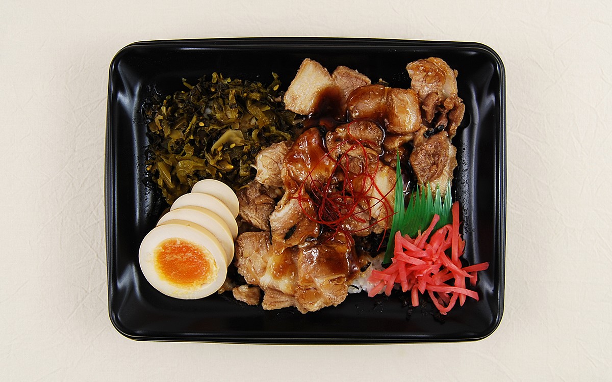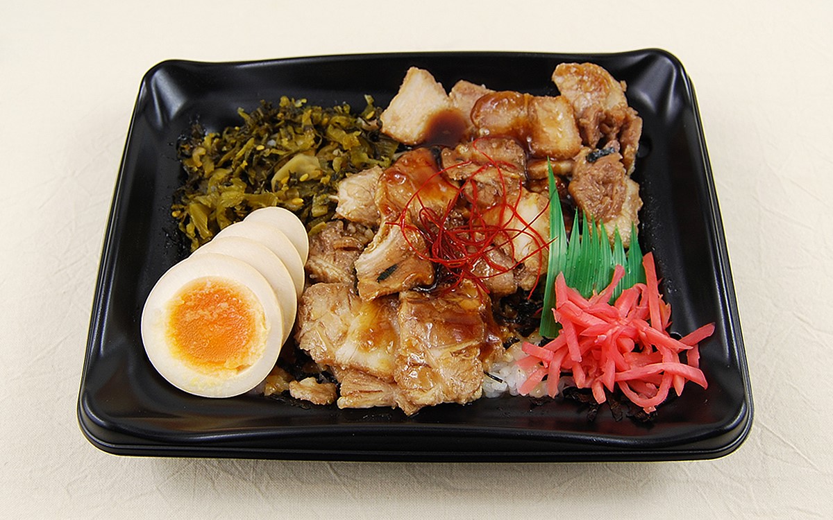 同商品は手頃な価格で楽しめる「ファミマトクトク弁当シリーズ」の1つです。ご飯の上には豚バラチャーシューと味付け卵、高菜漬などがトッピング。400円以下とは思えないほどたっぷり盛りつけられたチャーシューがご飯を覆い隠しています。