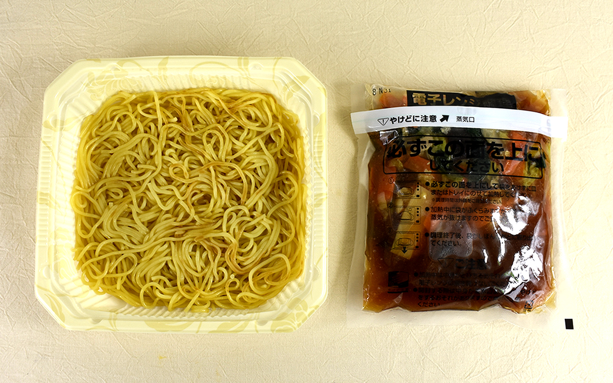 外袋を開けると、麺と具入りあんが別々に入っていました。食べる際は具入りあんの袋を麺の上に重ねて、電子レンジで約7分30秒~8分ほど加熱してください。温め終わったら麺に具入りあんをかけて完成。麺が入っていたトレーをそのまま皿がわりにできるのもポイントです。