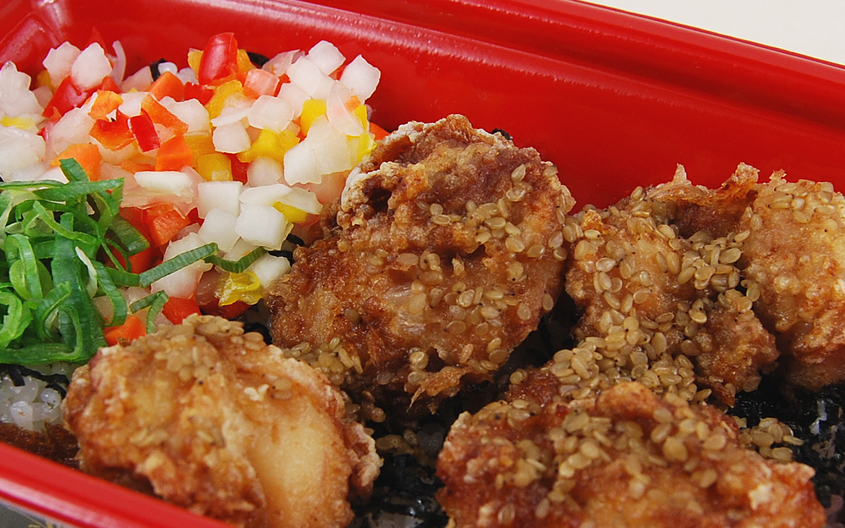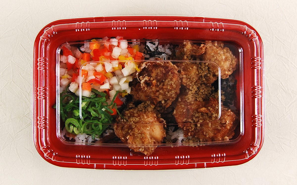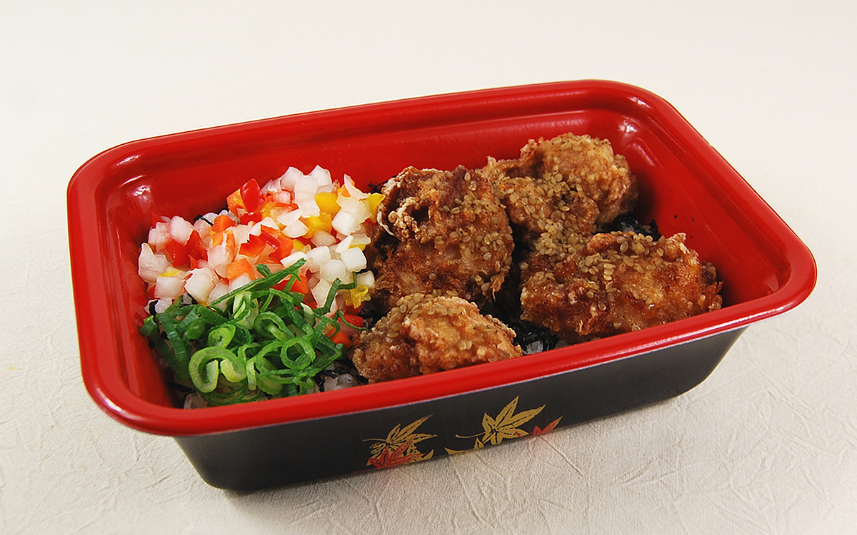 ご飯の上に大きな唐揚げが4個とピクルス&ネギが盛りつけられている同商品。パッケージを開封すると、胡麻醤油のこうばしい香りが漂って食欲が掻き立てられます。