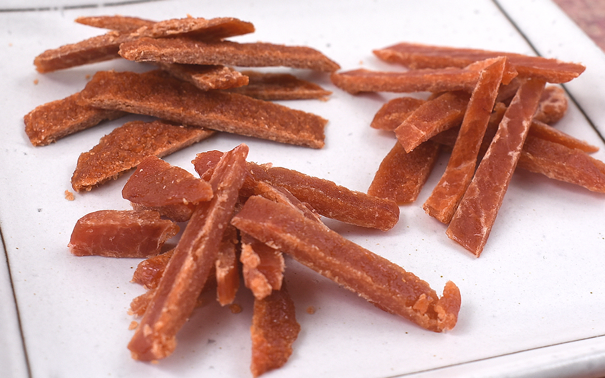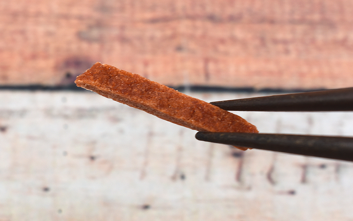 真空個包装で届く同商品。従来の明太子とは色・かたちともに大きく異なり、そのビジュアルはジャーキーのように見えるかも。パッケージ封入時はわらじ型をしていますが、「濃厚な味ですので、なるべく小さめにカットして少しずつお召し上がりください」との説明書きも添えられていました。