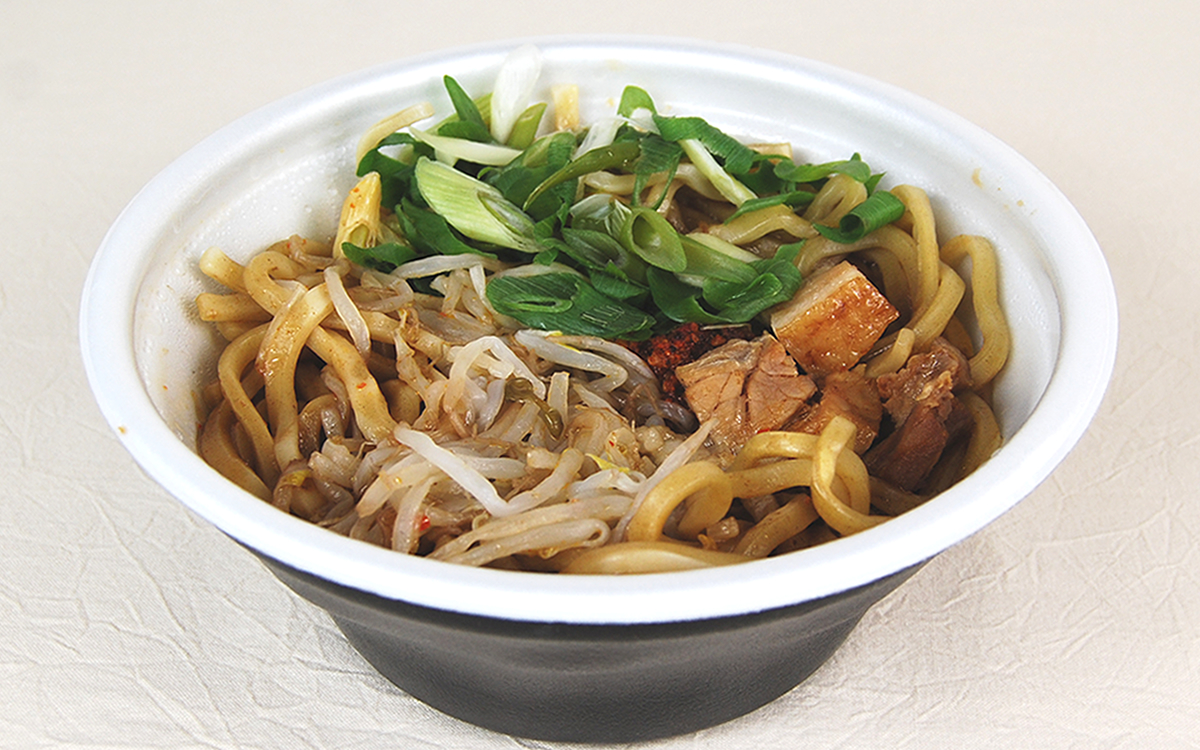 温めた商品のパッケージを外して最初に驚かされたのが、うどんと見間違えてしまうほどの太麺。見た目だけでなく口へと運んだ食感もインパクト抜群で、噛めば噛むほどモチモチとした弾力のとりこになっていきます。他の具材もたっぷりですが、麺もなかなかのボリューム。これはあっという間にお腹いっぱいになりそう…。