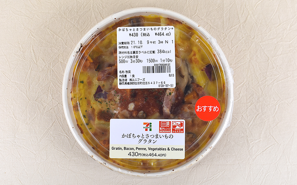 お腹の虫がやたらと鳴く、食欲の秋。季節ならではの食材も豊富で、たとえば海の幸ならサンマ、山の恵みならきのこなどの食材が挙げられますよね。秋の味覚が楽しめる献立を取り入れ始めた人も多いのではないでしょうか。欲張りな私は旬の食材を1度に楽しもうと、10月6日からセブン-イレブンで販売が始まった「かぼちゃとさつまいものグラタン」(464円/税込)を購入。果たしてそのお味は……?