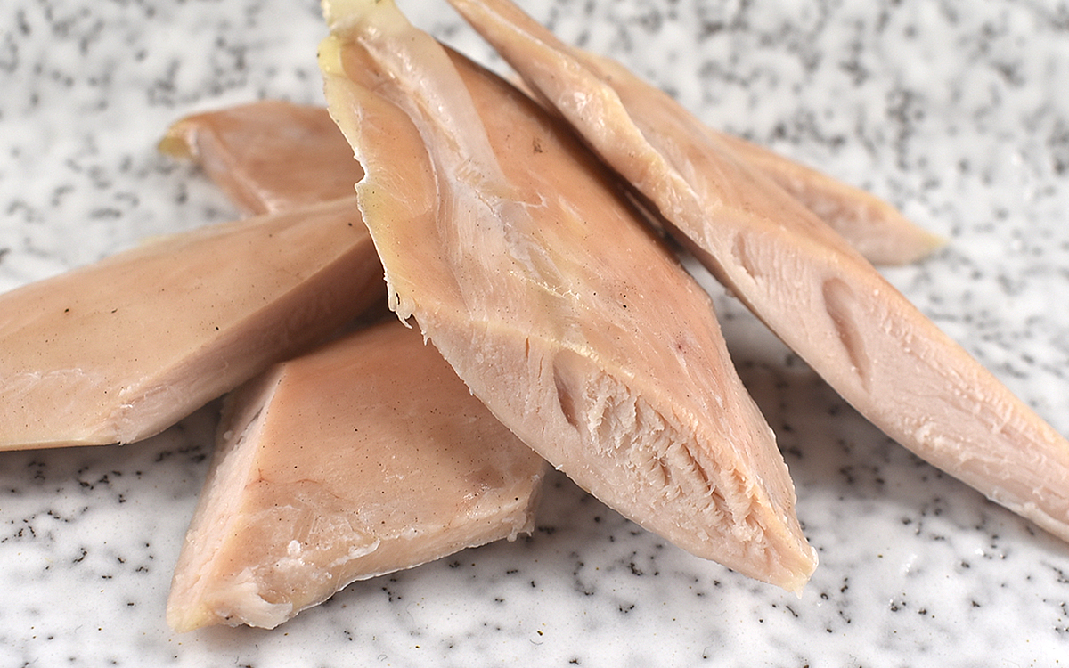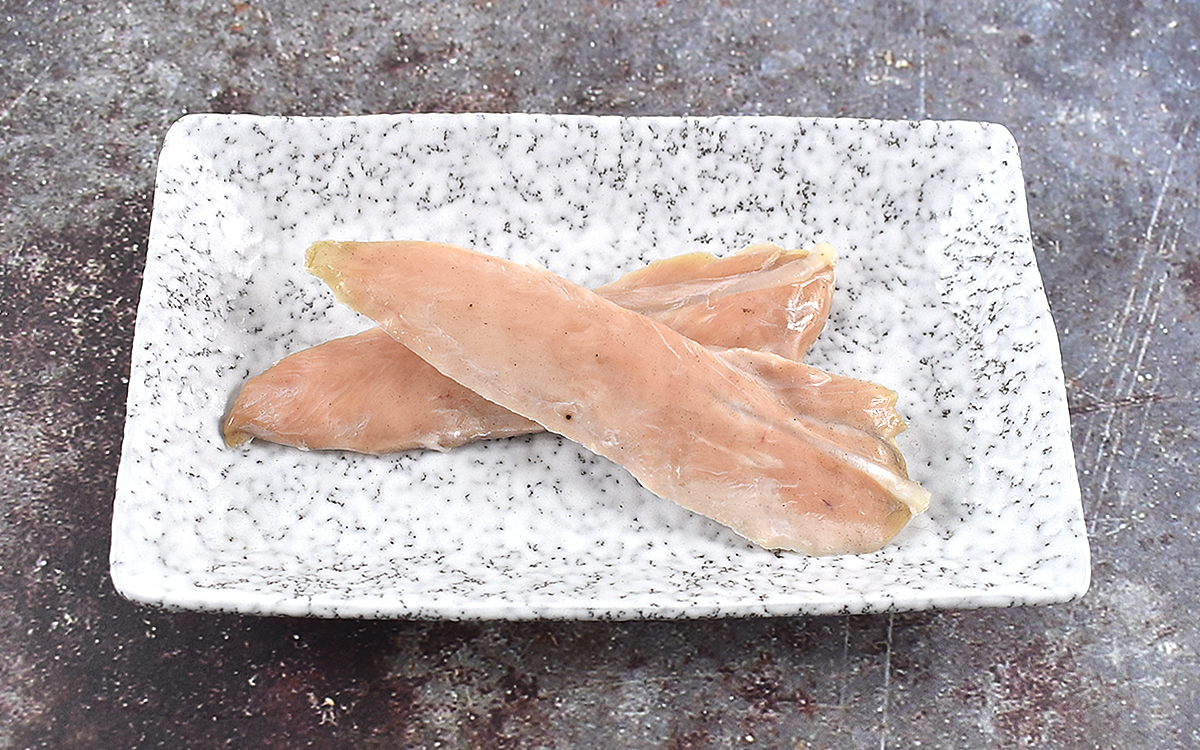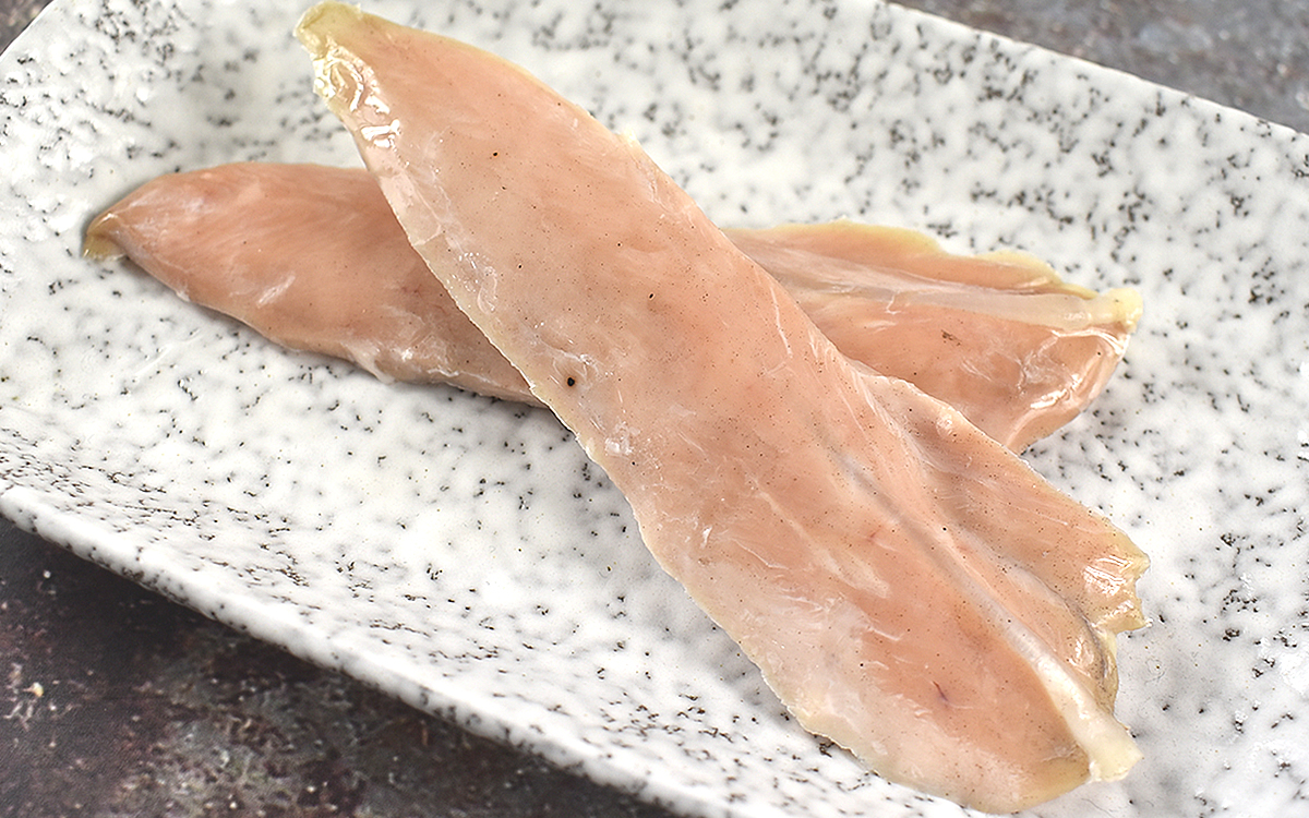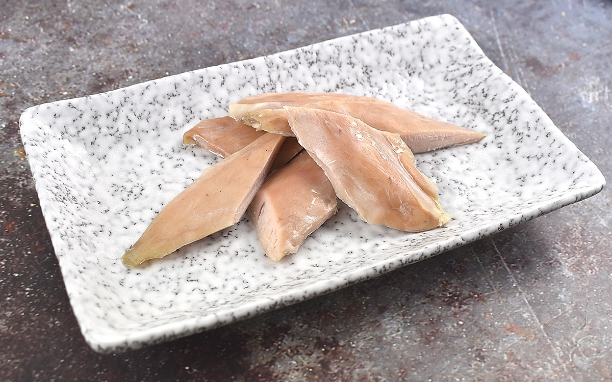ささみは淡泊であっさりした味わいながら、バランスの取れた塩味と甘みがGOOD。素材本来の深い旨味が感じられます。また表面はぷりっと弾力があり、中はふっくらやわらか。ささみ肉は火を通すとパサパサしてしまうイメージがありましたが、しっとりジューシーな舌触りを堪能できますよ。