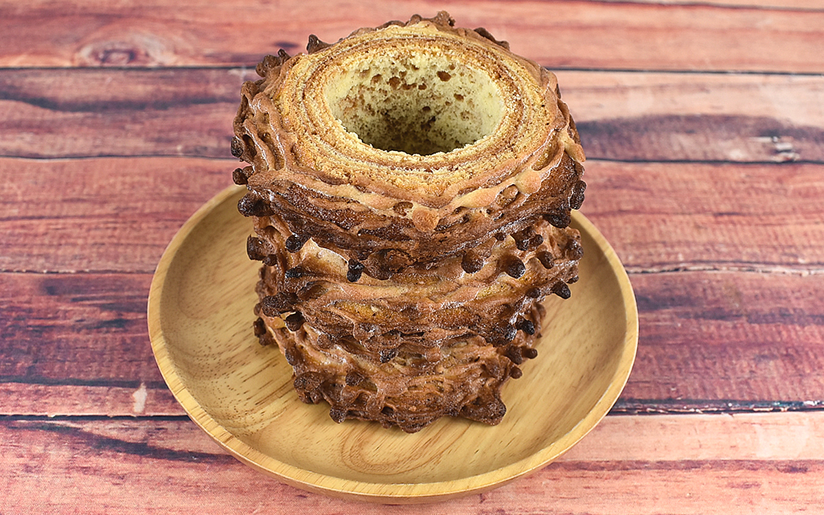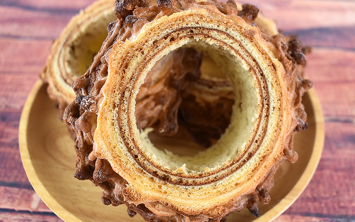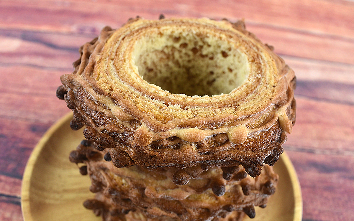 同商品は約10(長さ)×10.5cm(直径)で、3切れほどに分けるとちょうど食べきりやすいサイズ感。こんがり色づいたでこぼこの表面は、一見バウムクーヘンと分からないほどインパクト抜群ですよね。生地を焼く際にとても速いスピードで機械を回転させることにより、独自の形を形成しているそうです。