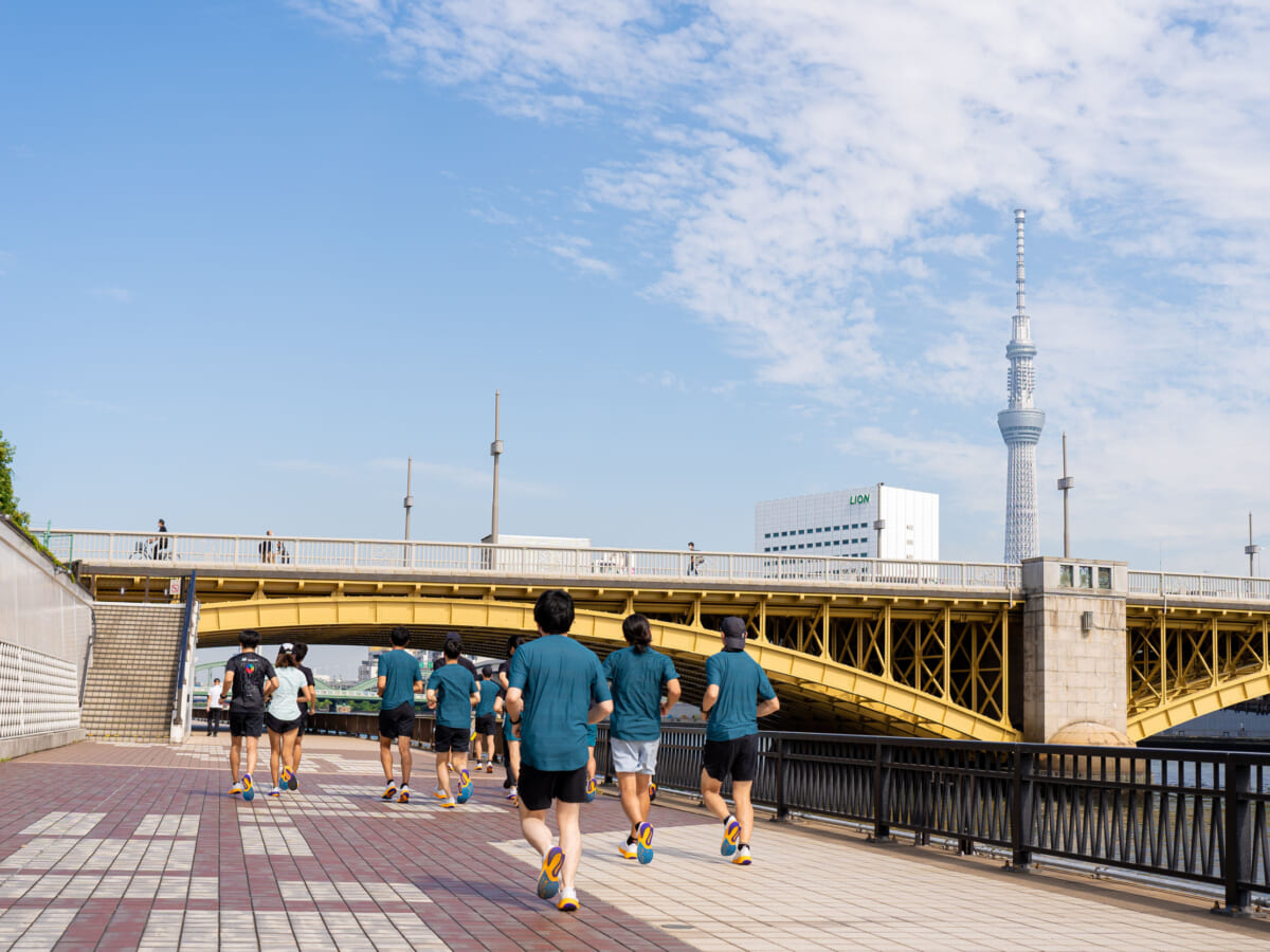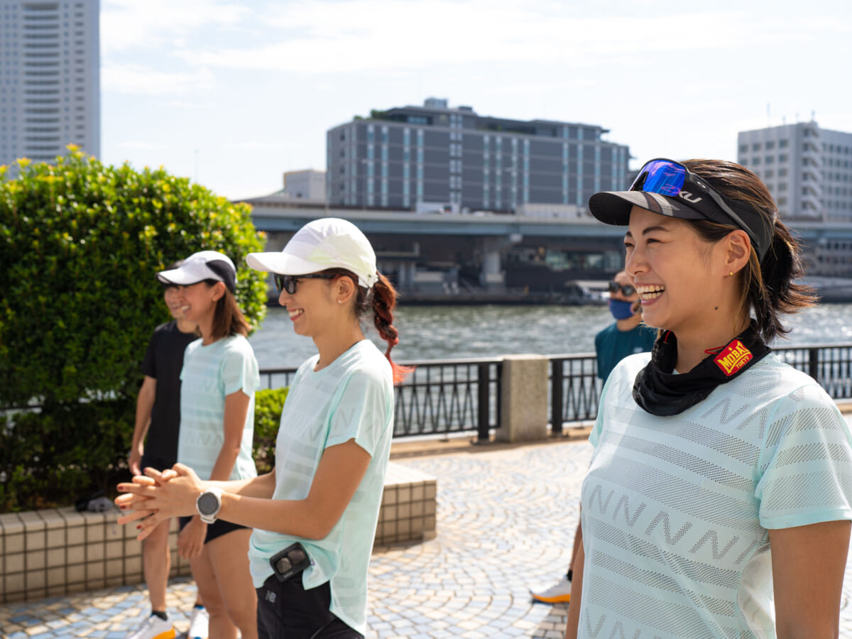 OUROURから墨田川の河川敷まで歩き、トレーナーによるウォーミングアップを実施してから、いよいよランニングです。「速い」「ゆっくり」の2チームに分けて走りだします。