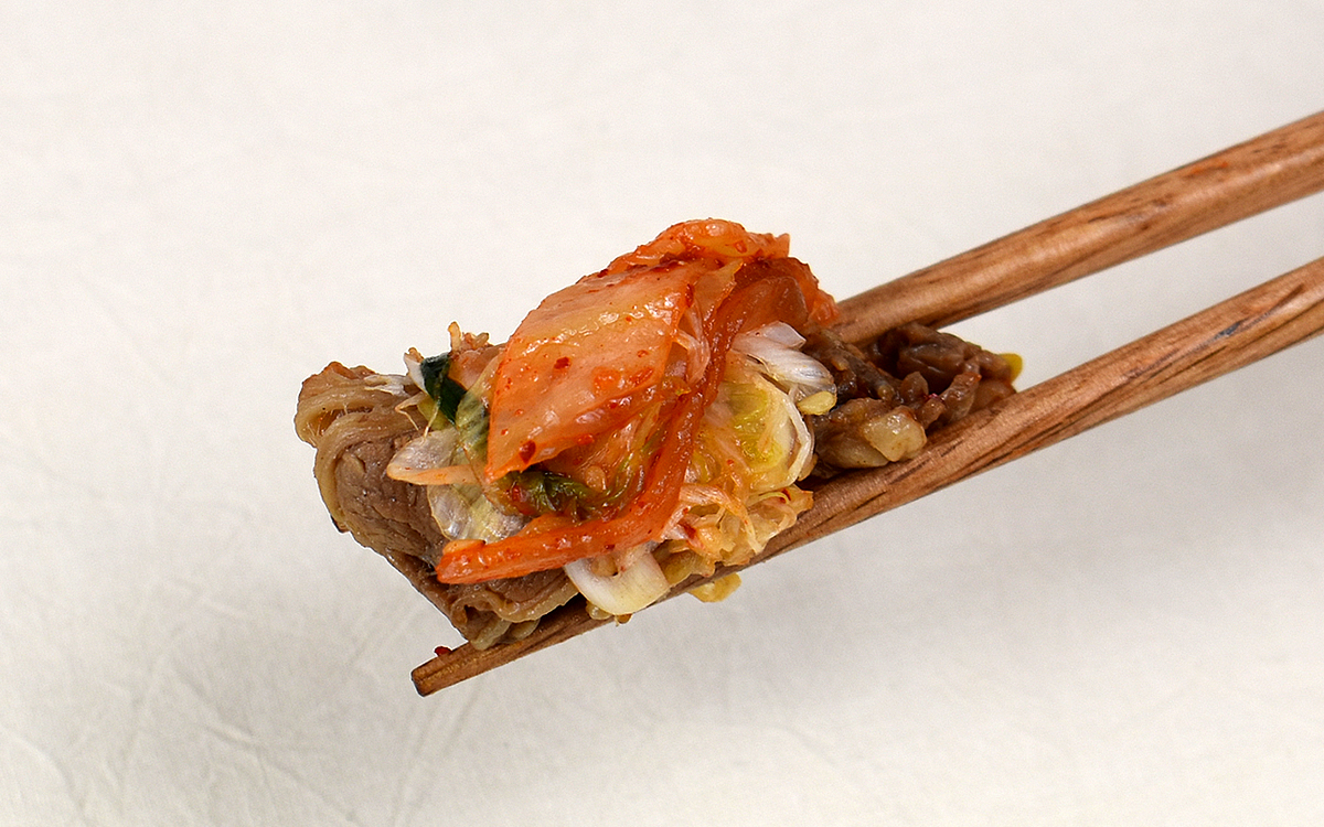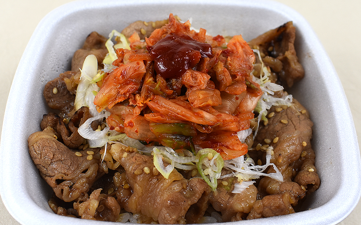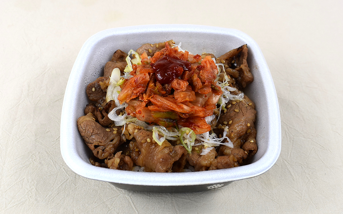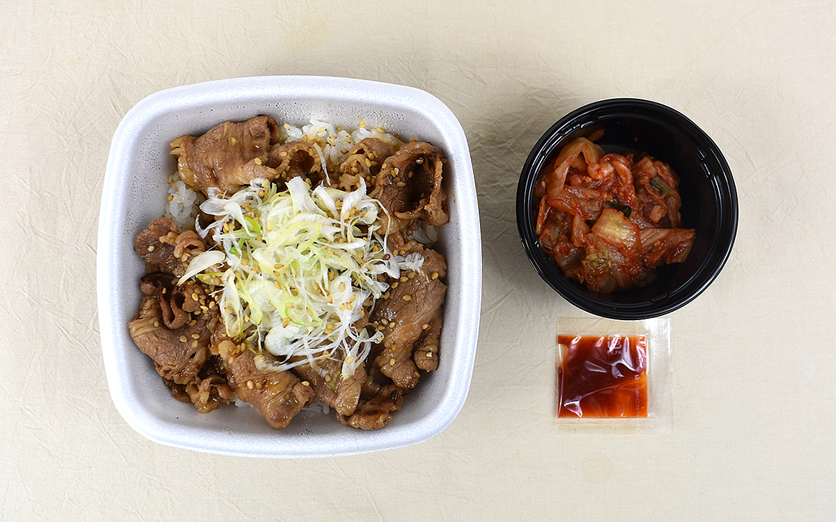 カルビとキムチはお馴染みの組み合わせですが、同商品の注目ポイントは肉が醤油だれで味つけされている点。またテイクアウトで購入するとキムチと甘辛いたれが別でついてくるので、トッピングする量を自分で調節できるのもうれしいですよね。