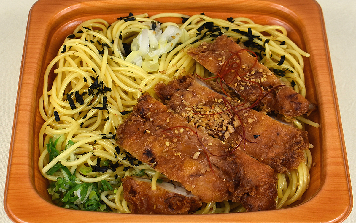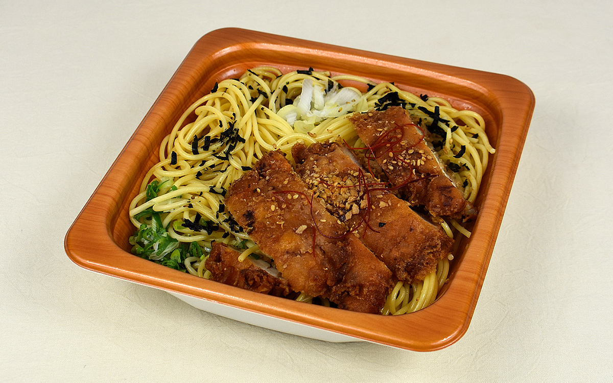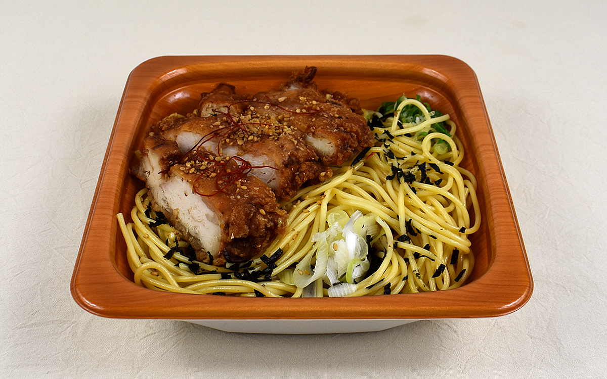 電子レンジで加熱してからフタを開けたところ、醤油とにんにくの芳醇な香りがふわり。麺の味つけには揚げ鶏との相性もいい“にんにく風味醤油だれ”が使用されていて、口に少し運んだだけで優しいコクに包まれていきました。にんにくの風味も感じますが、主張が強すぎることはなく醤油とのバランスも絶妙。醤油のさっぱりした味わいによって、“洋風”のイメージが強いパスタに新鮮味をもたらしてくれます。
