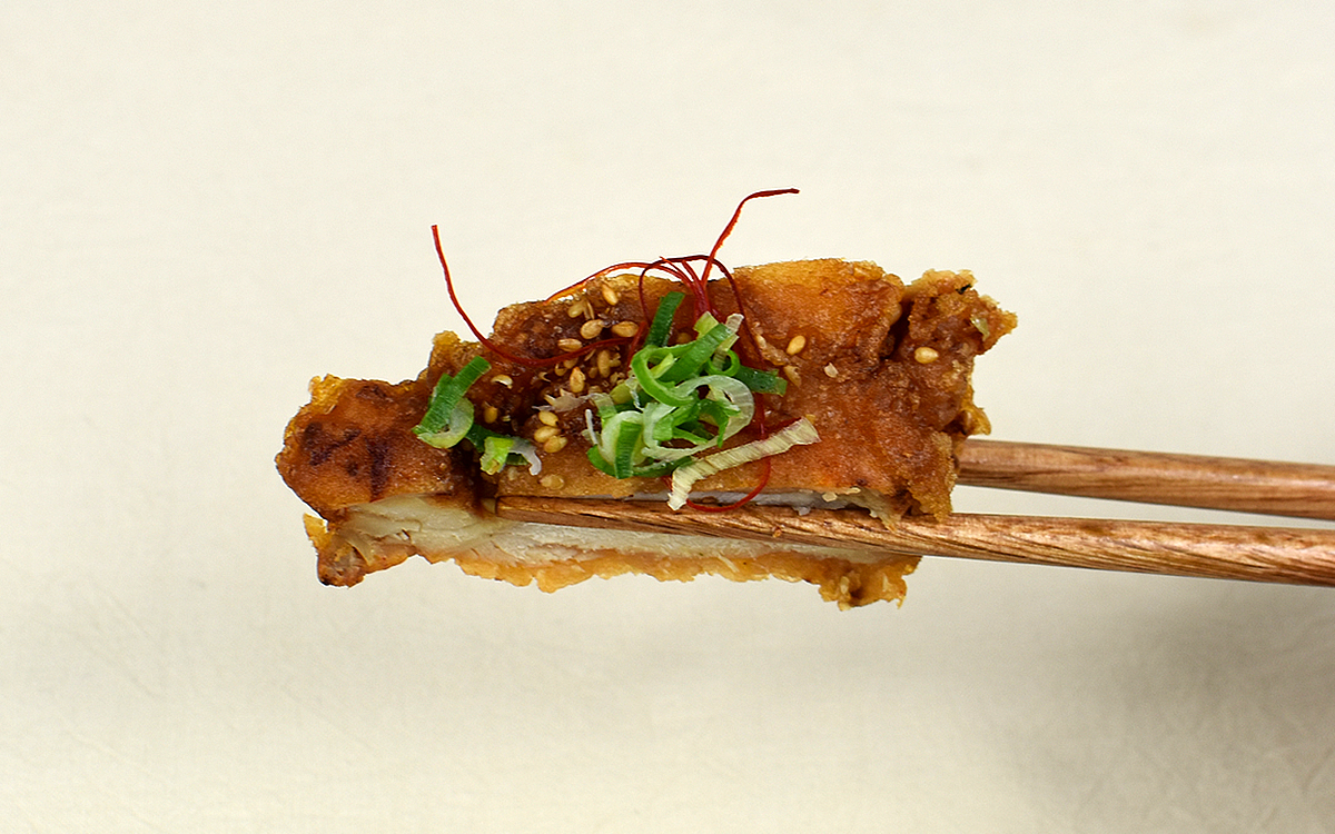 “和パスタ”の味わいに負けず劣らず、揚げ鶏が醸し出す濃厚な味わいもGOOD。商品公式ページによれば、鶏肉は清酒やにんにくダレなどに漬けこんで下味がつけられているそう。こうばしい衣に包まれたとり肉には厚みがあり、これでもかと弾力を感じさせてくれる歯ごたえがたまりません。
