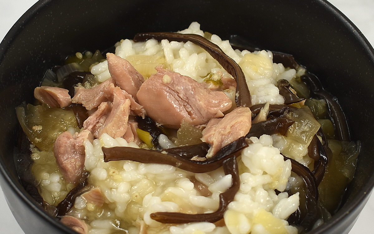 お茶漬けのような見た目をしている一方で、薬膳料理らしい独特の香りがふわっと漂ってくるのが新鮮。さっそく一口食べてみたところ、とり肉の旨味が染み出た優しい味わいが口の中に広がりました。コリコリした歯ごたえが楽しいきくらげと、トロっとやわらかいねぎの食感もGOOD。高麗人参を効かせたスープは独特の風味をほんのり感じるものの、思ったよりクセがなくて食べやすい仕上がりです。体の芯から温まるようなホっとする味を堪能できました。