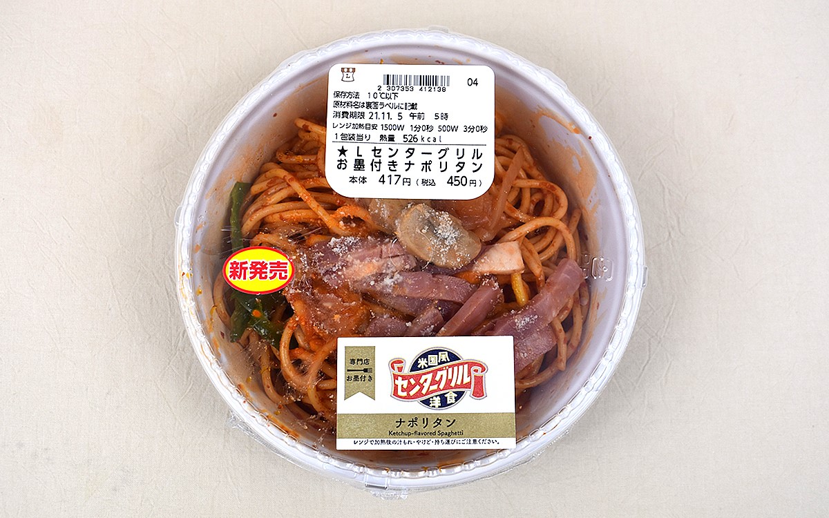 パスタの中でも“昔ながらの味わい”を楽しめるメニューといえば、ケチャップのこうばしい香りが特徴のナポリタンですよね。洋食店の定番メニューであり、好んで注文している人も多いのでは? かく言う私もナポリタンファンの1人。たまたま訪れたローソンで「センターグリルお墨付き! ナポリタン」(450円/税込)という商品を発見し、“お墨付き”の文言に惹かれてさっそく購入してみました。どのような味わいを堪能できるのか、お手並み拝見といきましょう。