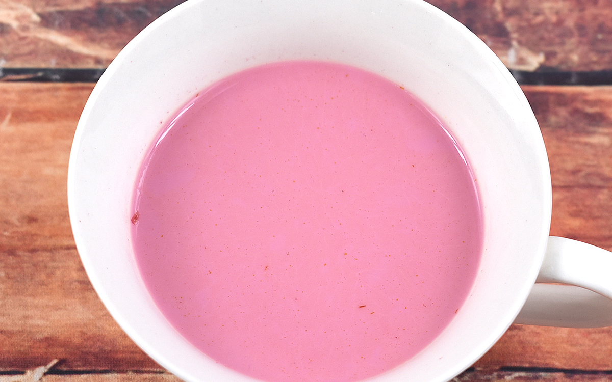 使用されているのは北海道産のビーツ。ペースト状にしたビーツと、トマト・玉ねぎ・チキンエキスなどが配合されているそうです。1人前35g入りの袋が2つ入っており、牛乳や豆乳(1袋につき100ml~130ml)に溶かして完成。あっという間に鮮やかなピンク色のポタージュが完成しました。