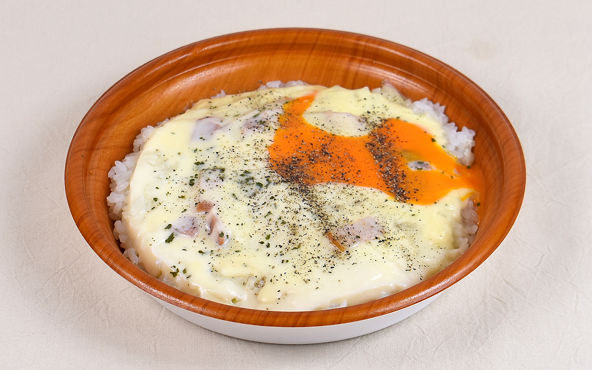 “カルボナーラ”といえば真っ先にパスタを連想させるため、ライスとの組み合わせはちょっと意外。チーズにはゴーダ、チェダー、モッツァレラの3種が使われていて、ライスの上にたっぷりとホワイトソースがかかっているのも特徴の1つです。