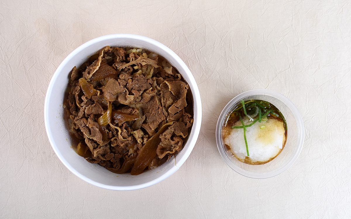 テイクアウトでは牛丼とおろしポン酢がそれぞれ別パッケージになっている同商品。並盛とは思えないほどボリューム感のある牛丼もさることながら、ポン酢が絡む大根おろしも艶があって目を引き寄せられます。ちなみに商品公式ページによると、大根おろしは店舗ですりおろされているそう。
