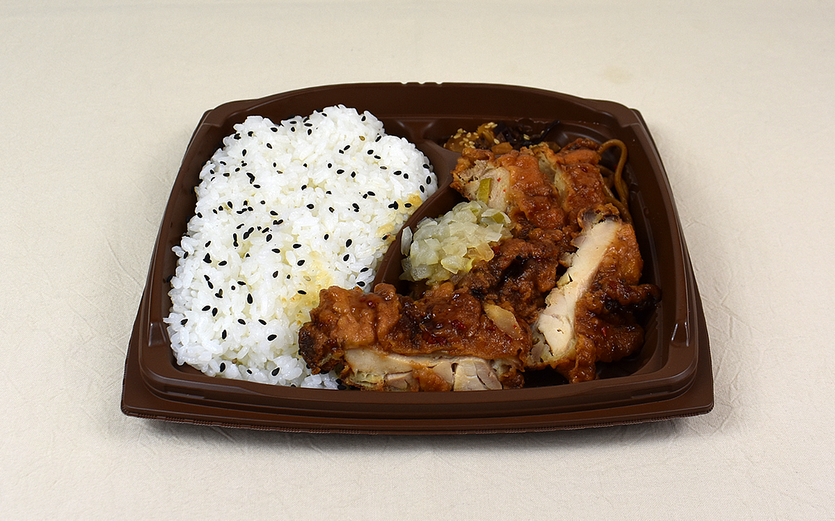 トレイにぎっしり詰まったご飯と、分厚くカットされた油淋鶏がドン! と盛り付けられた同商品。シンプルな組み合わせですが、とにかくボリューミーなのがうれしいところです。たんぱく質豊富なとり肉をたっぷり味わいたい人にもピッタリな一品ですね。