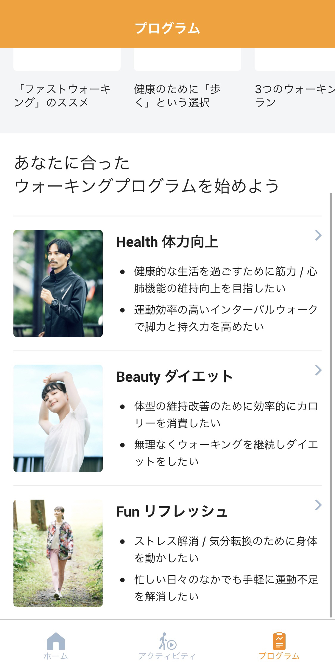 使う人に合わせてウォーキングプログラムを作成してくれるということで、私もさっそく作成してみました。プログラムは「Health 体力向上」、「Beauty ダイエット」、「Fun リフレッシュ」3つの項目から選択可能です。