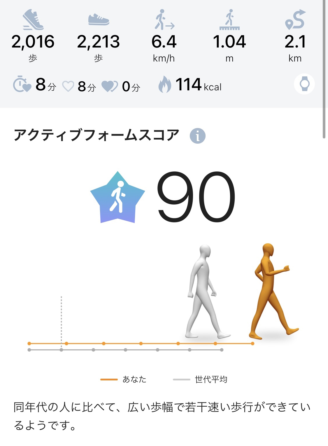 このように、自分の歩行スピード、歩幅、心拍などを、同年代の平均と比較したスコアをチェックできます。大股で早歩きを意識して歩いたので、なかなか良いスコアが出た気がします。(持久力には自信があるのに!と思いましたが、ウォーキング時間が短いとスコアが低く算出されることがあるそうです)