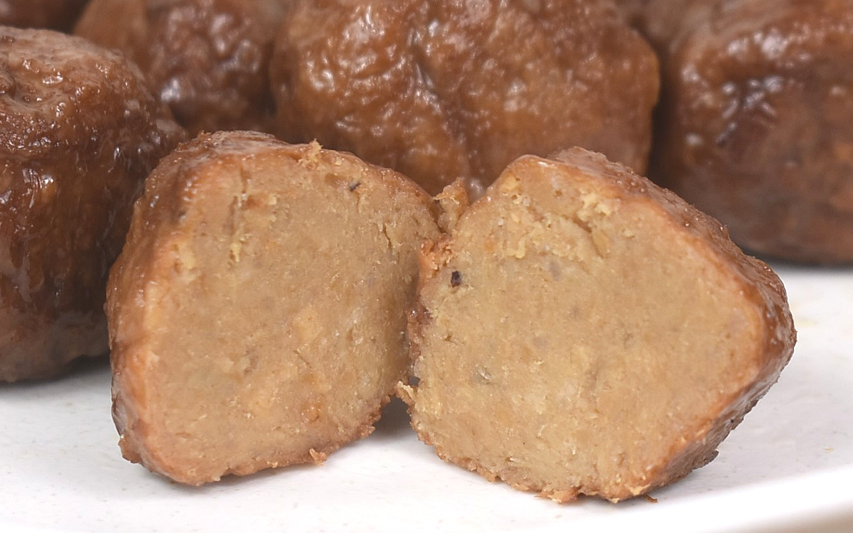 さっそくミートボールを皿に移し替えたところ、従来品とはほとんど差のない外観にびっくり。焼き色のついた表面はツヤがあって、言われなければ大豆ミートとは気づかないのでは?