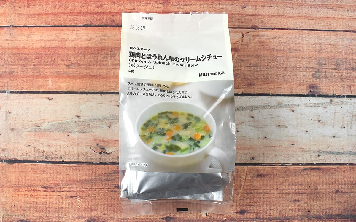 寒い季節に食べたくなる料理といえば、クリームシチューを思い浮かべる人も多いのでは? しかし自分で作るとなると具材を切ったり煮込んだりと手間がかかりますよね。そこで今回は無印良品の「食べるスープ 鶏肉とほうれん草のクリームシチュー」(390円/税込)を購入。お湯を注ぐだけで手軽に食べられる、スープ感覚のクリームシチューです。