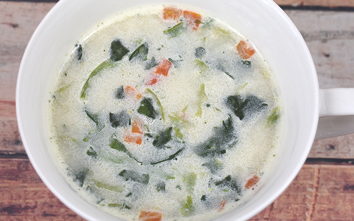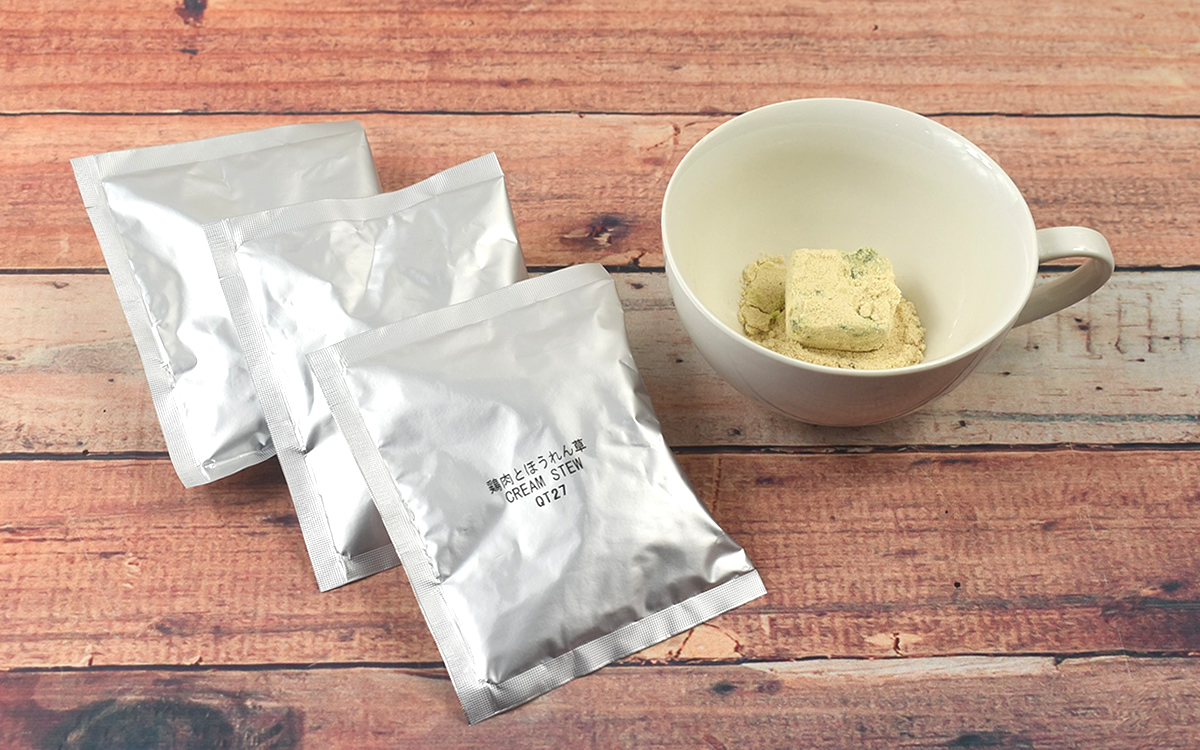 鶏肉・ほうれん草・3種類のチーズなどを使ってクリームシチューを再現した同商品は、1つあたり4食入り。フリーズドライの具材ブロックと粉末スープを組み合わせて作られているのが特徴です。食べる際は160mlの熱湯をフリーズドライの上から注ぐだけでOK。しっかりかき混ぜてから、約1分ほどであっという間に完成しますよ。