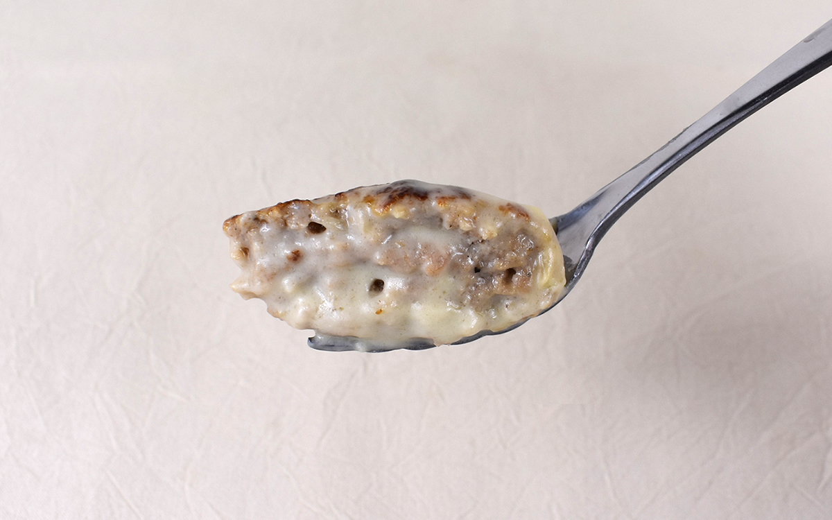 食べる前に電子レンジで加熱したところ、“けずりチーズ”が溶けてハンバーグを覆う状態に。溢れんばかりの白いソースをたっぷりまとわせて一切れ頬張ると、チーズのコクと肉のジューシーな旨味が口いっぱいに広がりました。トロトロのチーズソースはほどよい酸味とクリーミーな味わいが絶品。また、肉厚なハンバーグはスっと簡単にフォークが入るほどやわらかく、噛むたびに肉汁がじゅわっと溢れてきます。