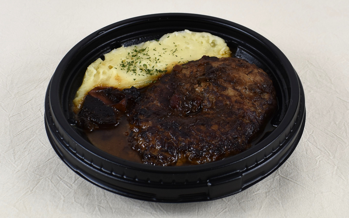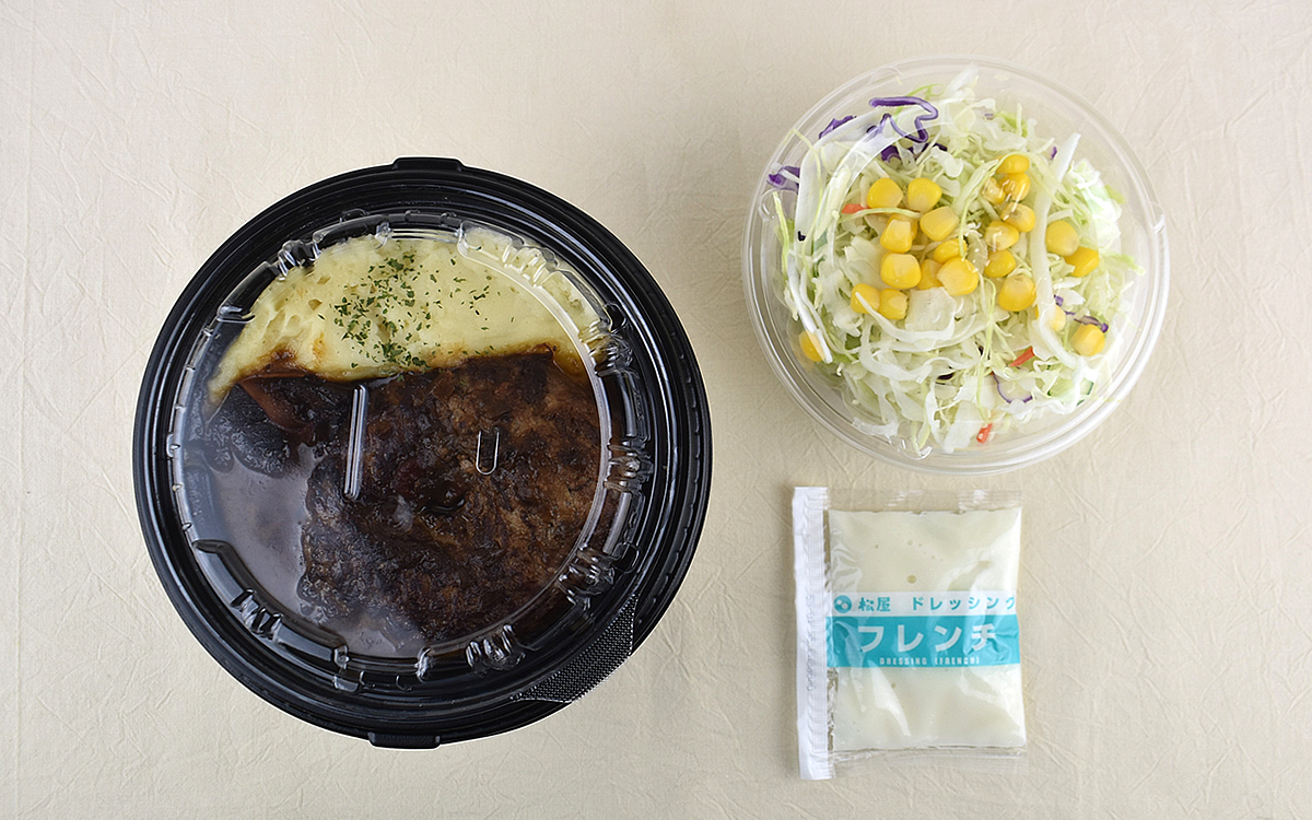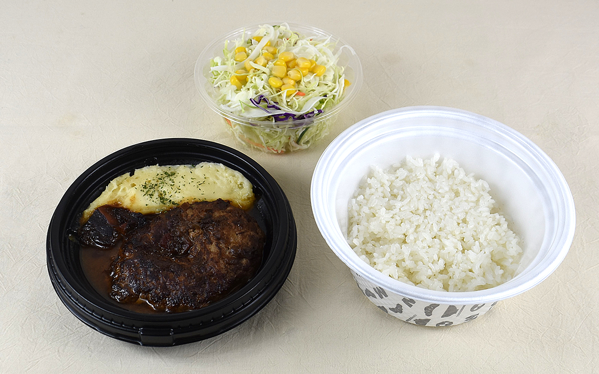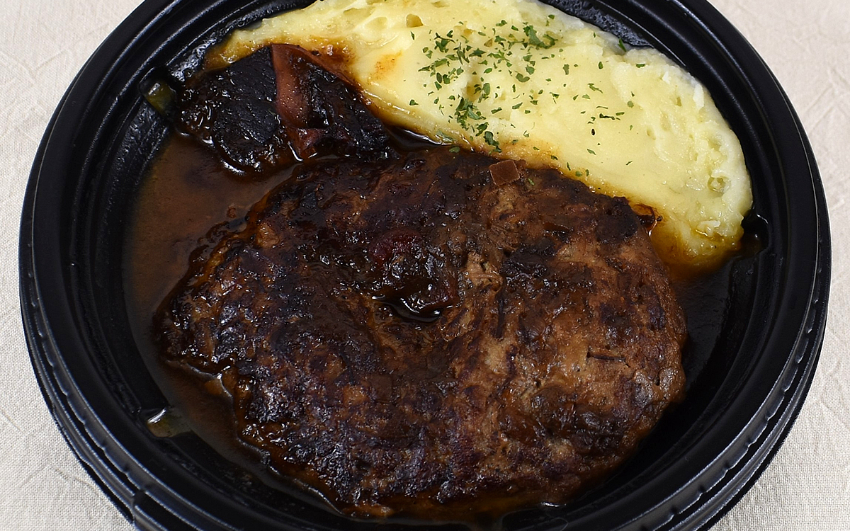 フタを開けた際に気になったのは、ハンバーグの中央に開いている1つの穴。じつはここが注目ポイントで、穴の内側には「美味しさ詰込みポケット」という空洞部分が。中央のポケットにソースを入れて染み込ませることにより、味わい深いテイストに仕上げているそうです。