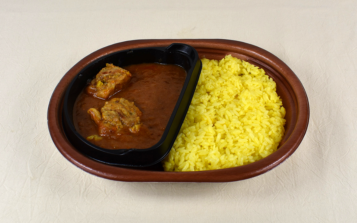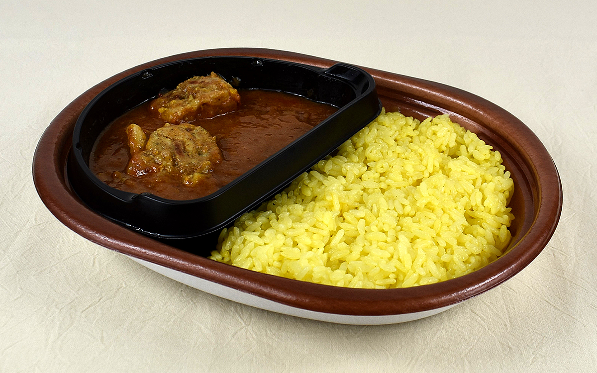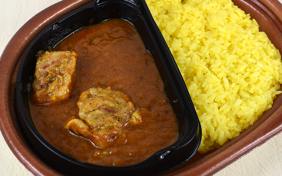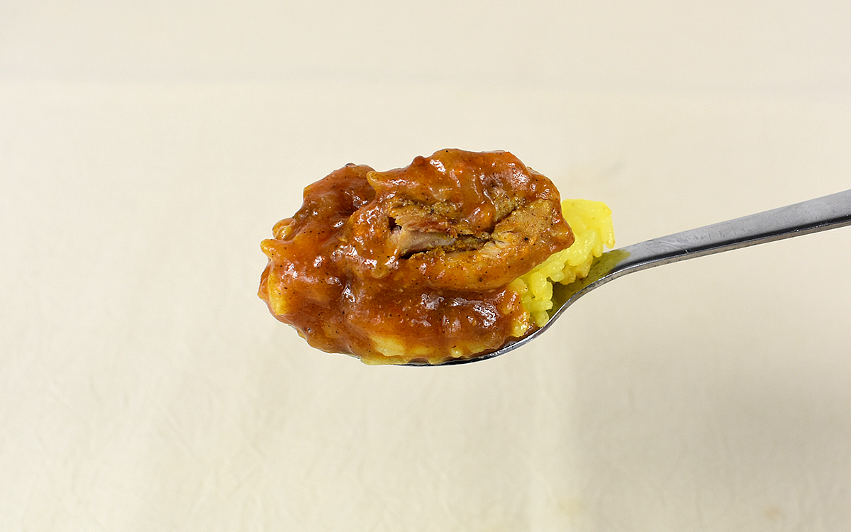とり肉がごろごろっと入ったチキンカレーと黄色の味付ご飯が組み合わされた同商品。さっそく電子レンジで加熱すると、食欲をそそるスパイシーな香りが漂ってきました。カレールーは“どろどろ”と“サラサラ”の間で、ご飯にも馴染みやすいとろみ感です。