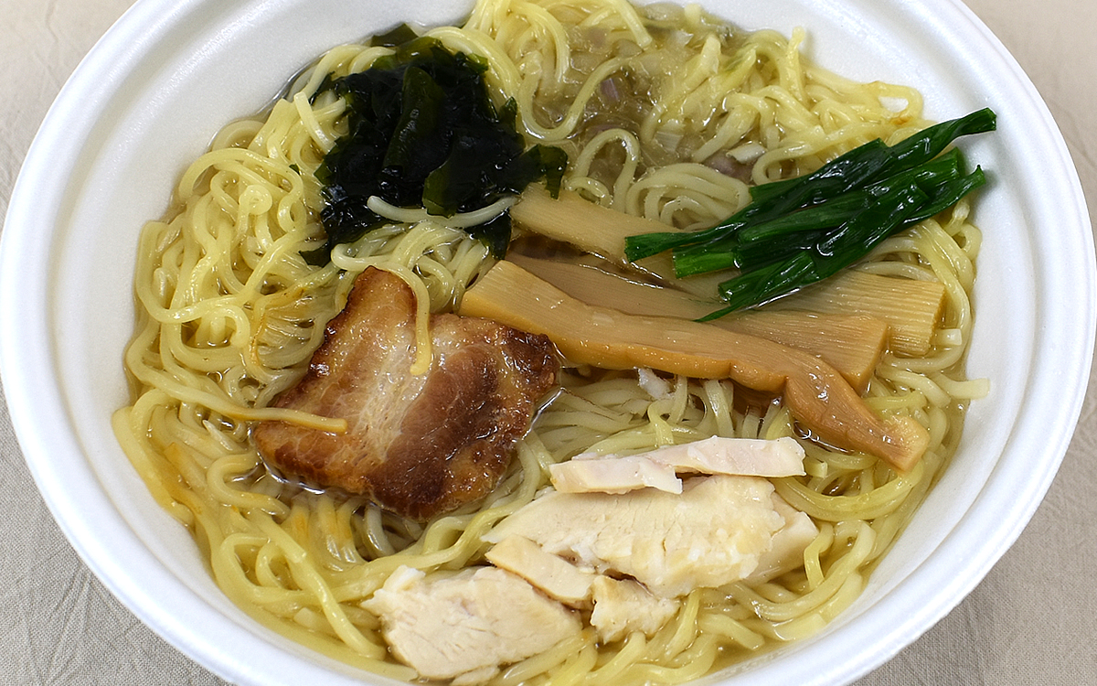 麺やスープに加えて、豊富なトッピングも同商品の大きな魅力。焼豚とは別に“味付蒸し鶏”が添えられていて、貝だしに馴染むとり肉の旨味がたまりません。他にもメンマ・ワカメ・ねぎの定番トッピングに、細かく刻んだ紫玉ねぎも存在感をアピール。どの具材も主張が強すぎることはなく、貝だしスープのコクを引き立てるのに一役買っていました。