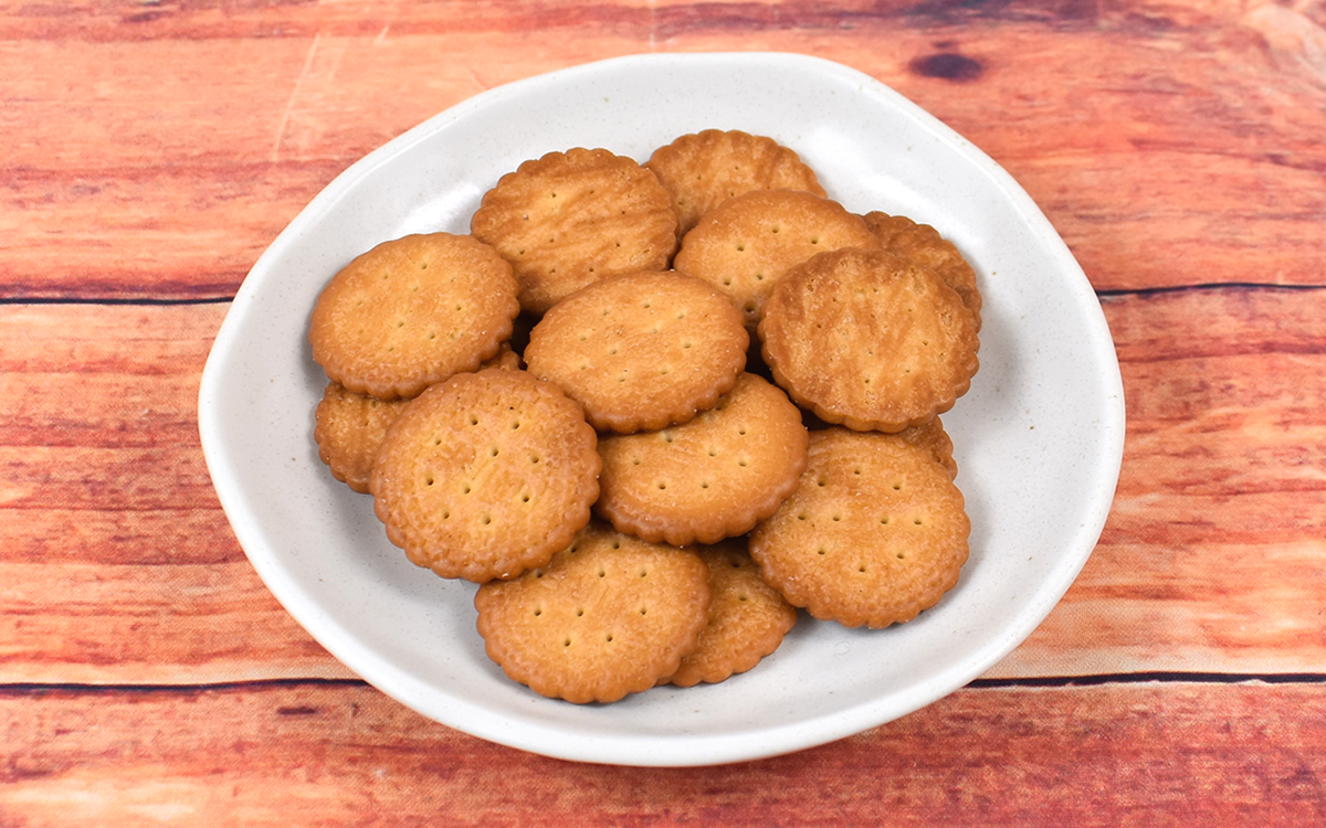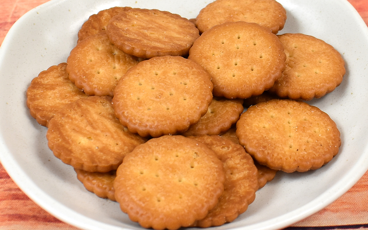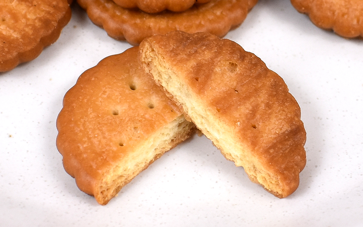 それでは、さっそくビスケットをいただいてみましょう。内容量100gとあって枚数は多く、小腹が空いた時にぴったりのボリューム。昔ながらのかたちをしたビスケットは歯ごたえがあり、ひとかじりした瞬間に響き渡る“パキっ”という音が心地よさを感じさせてくれるほどです。