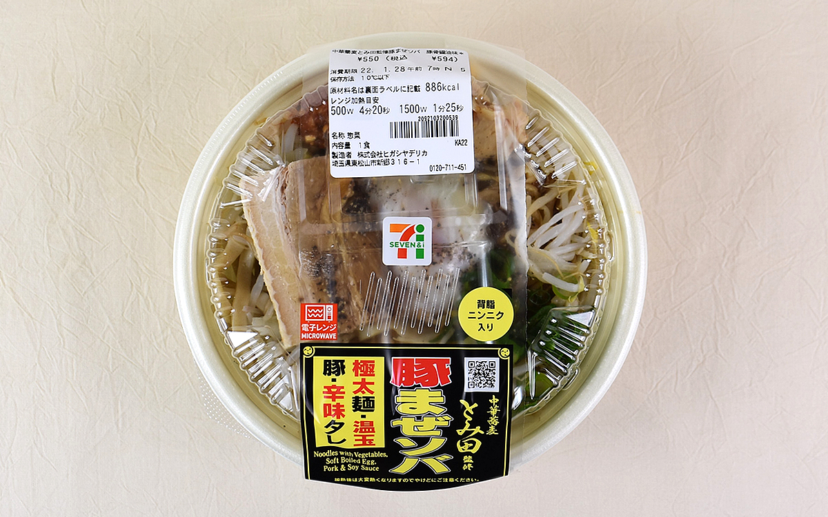 油そばや台湾まぜそばなどの“汁なし系”麺料理。専門店はもちろん、最近ではコンビニ弁当や冷凍食品でも手軽に楽しめますよね。そこで今回はセブン-イレブンから新登場した「中華蕎麦とみ田監修豚まぜソバ 豚骨醤油味」(594円/税込)を購入。これまでに何度もコラボ商品を手がけてきた人気店「中華蕎麦 とみ田」監修の、豚を味わう温かいまぜソバです。