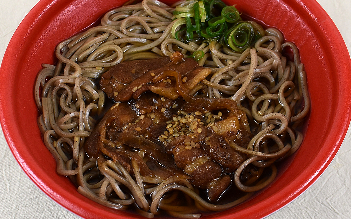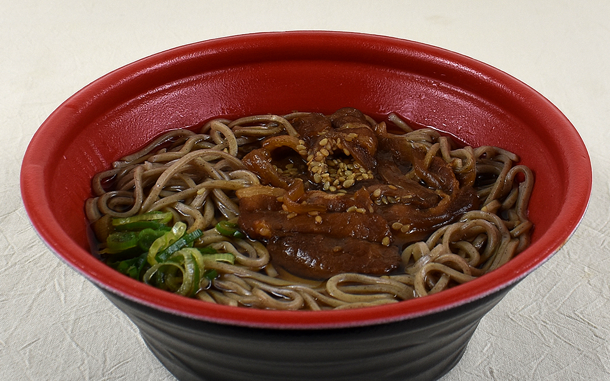 つるんと飛びこんでくるそばは、しっかりコシのある食感がGOOD。もちろん豚肉・玉ねぎ・つゆとの相性もよく、刻みねぎやゴマがアクセントになって味の変化も楽しめます。ちなみに小袋の七味とうがらしも添えられているので、濃厚な味わいの中にも「刺激がほしい」という人にぴったりではないでしょうか。