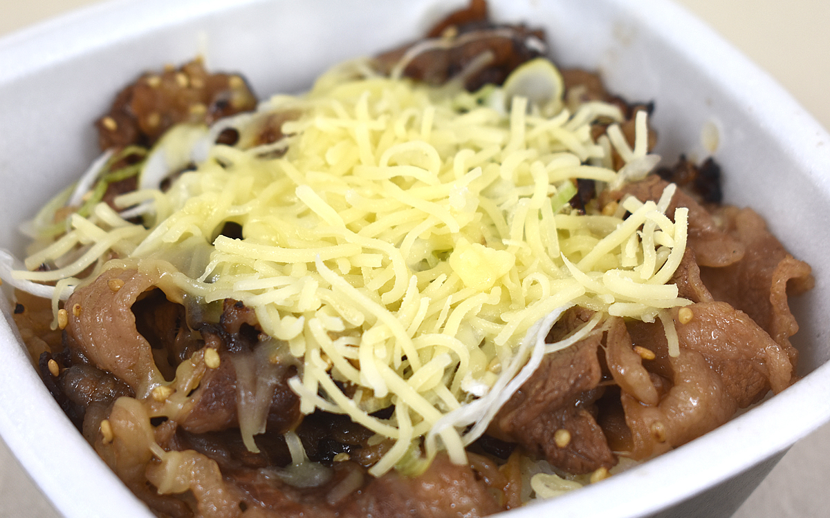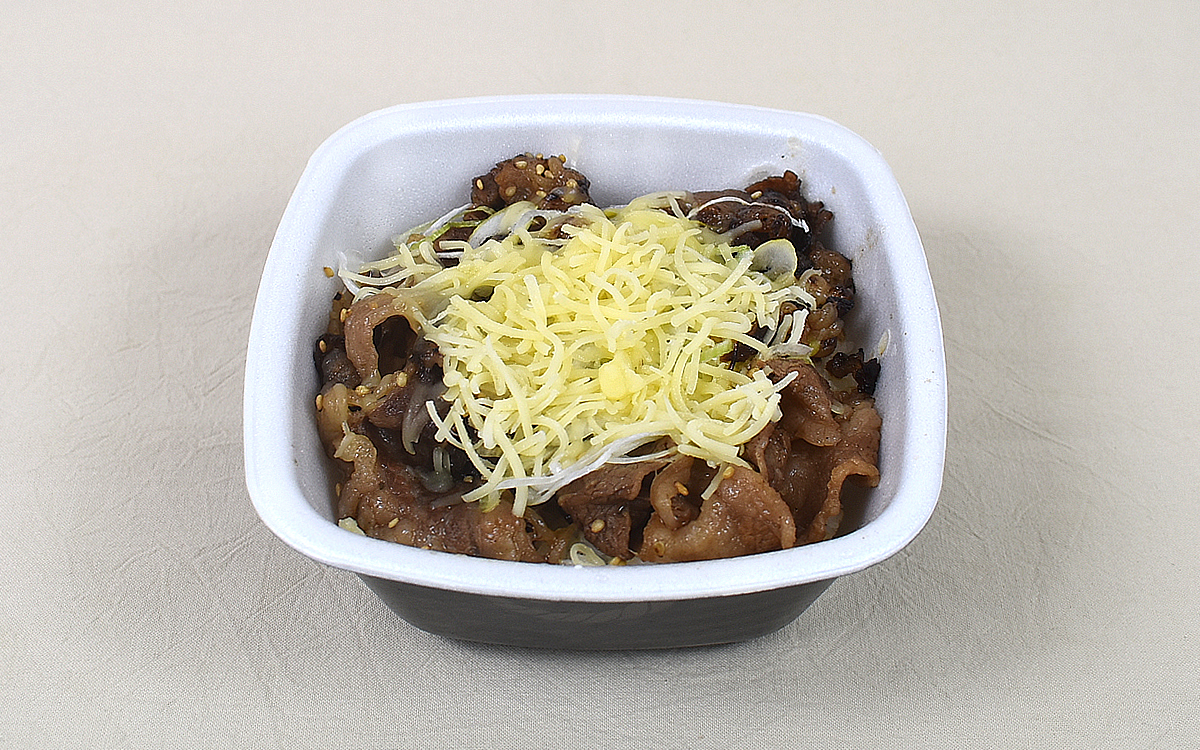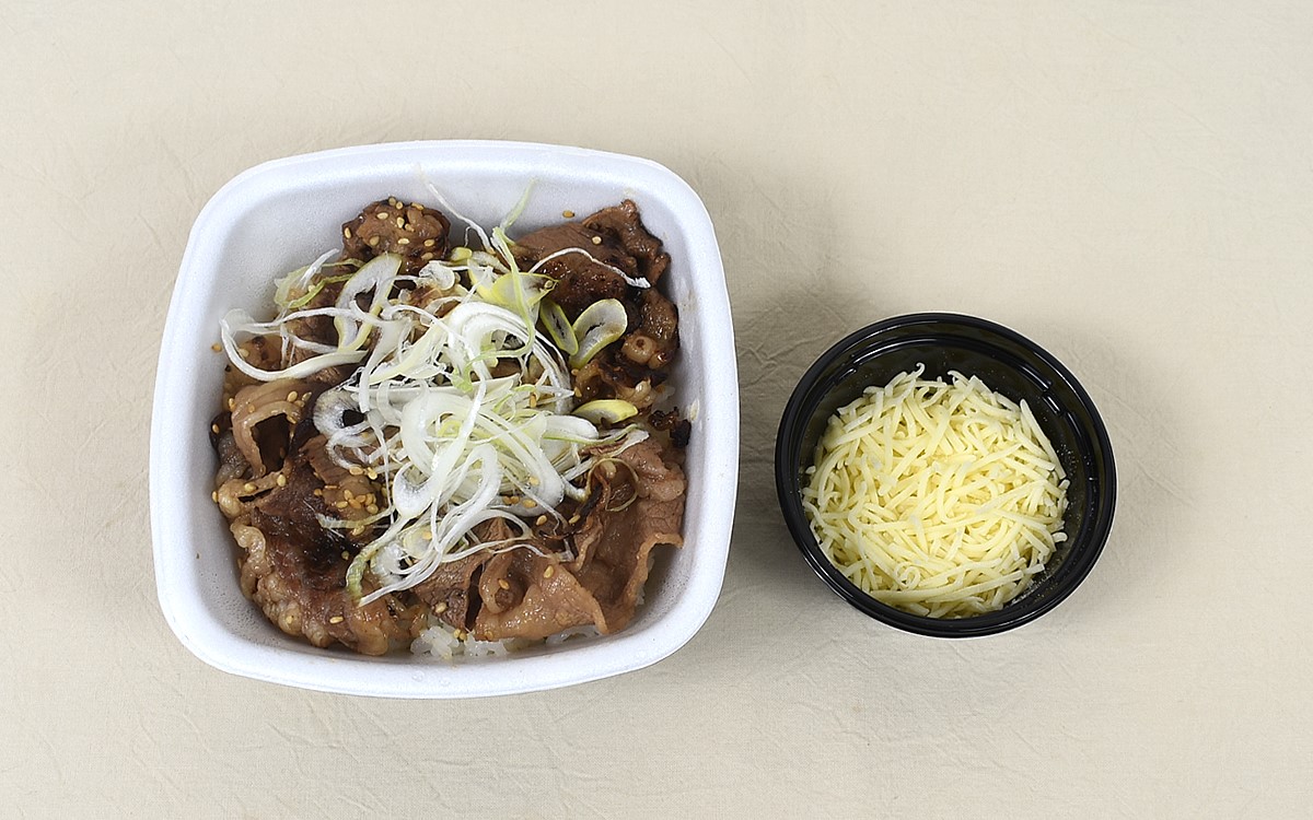 白飯の上には、醤油だれで味つけしたカルビ肉と白ネギが乗っています。また、別で用意されたチーズもセットに。思ったよりもチーズの量が多く、すべてかければ“チーズましまし”くらいのボリュームになりそう。お好みの量をかけて大丈夫ですが、足りなくなった頃合いで入れるのもアリだと思います。