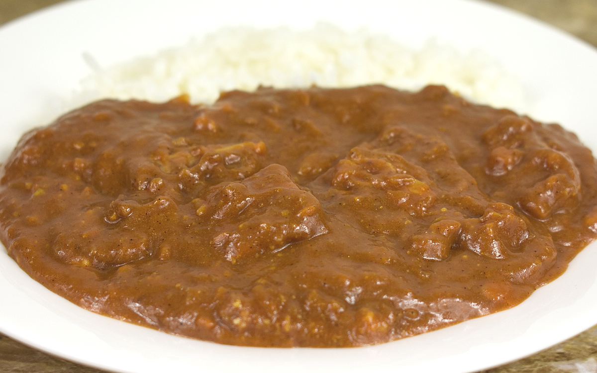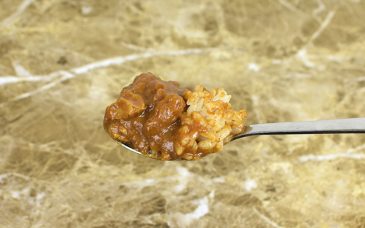 まずは、カレーを耐熱容器に移し替えて電子レンジ調理(加熱目安/500Wで約3分)し、あらかじめ準備しておいたごはんの横に投入。漂ってくる香りからは、こうばしさの中にもスパイスの存在を感じさせてくれます。それもそのはず、同商品の辛さは5段階表示で“激辛”の手前に位置するレベル4に該当。ガラムマサラやクミン、唐辛子などのスパイスを使用しているのが特徴です。