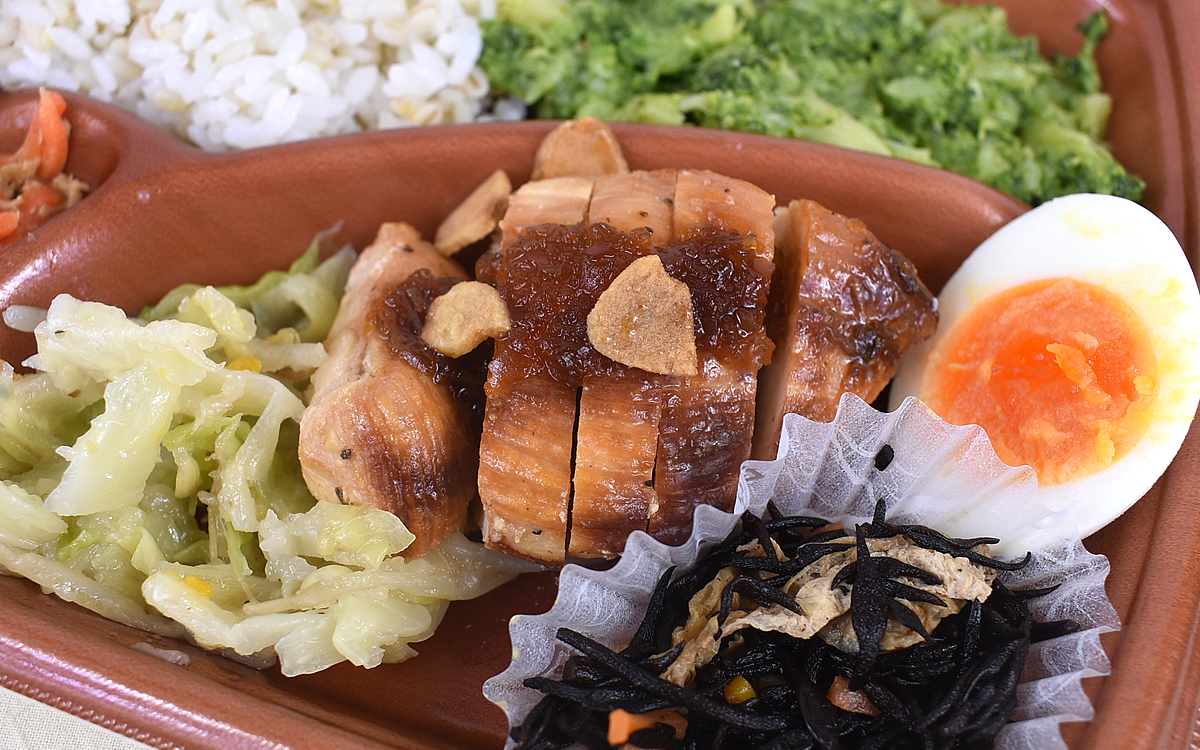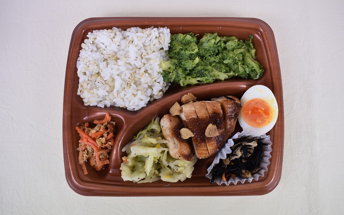 メインは、にんにく&生姜などで下味をつけた鶏むね肉。副菜の種類も豊富で、ブロッコリーの和えものやキャベツもやし炒め、ひじき煮、人参玉子かつおフレーク炒め、ゆで卵が。ご飯には“もち麦”がプラスされており、全体的にヘルシーな具材のラインナップという印象ですね。続いて1つ1つの味をチェックしていきます。