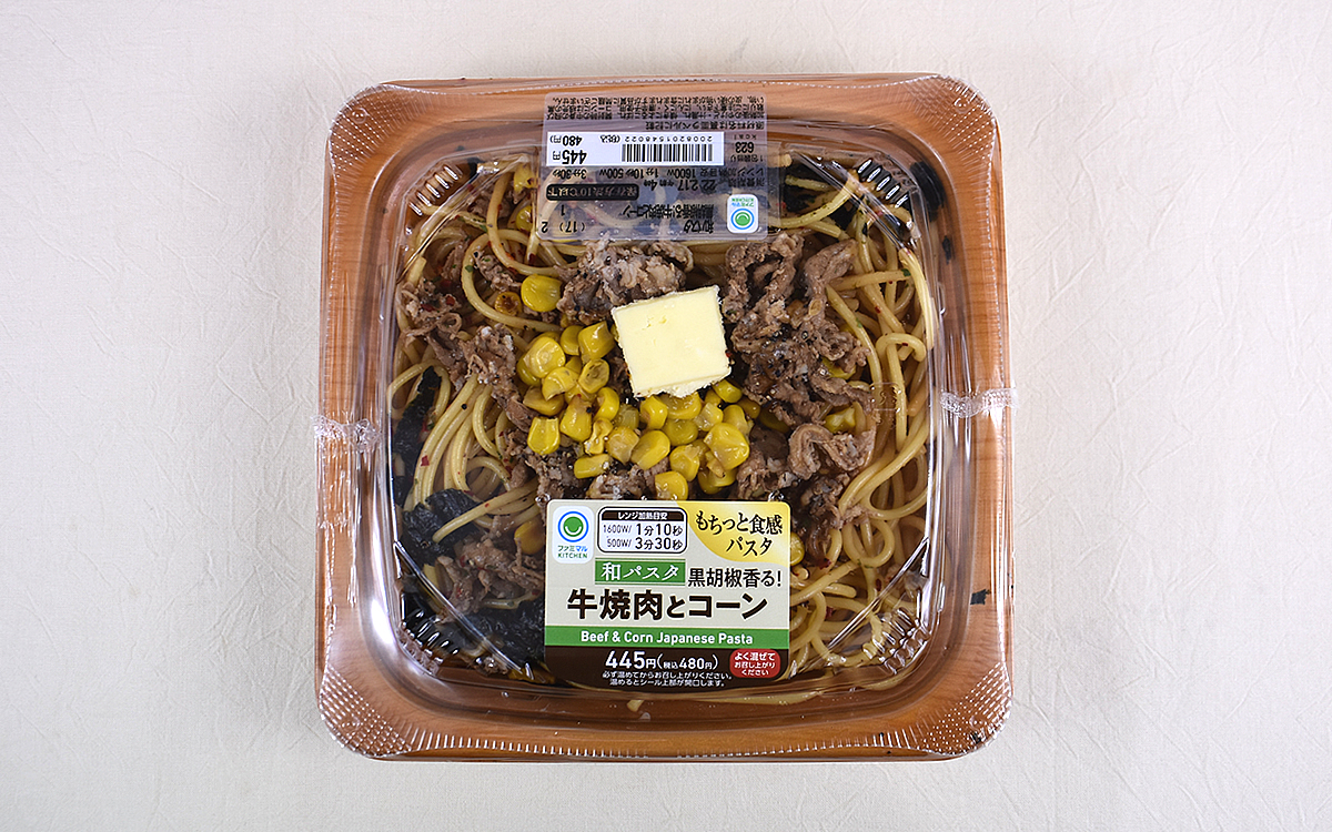 コンビニ各店に並ぶパスタはよりどりみどりで、定番の味からトッピング・味つけに工夫をこらしたメニューまで様々。購入する商品を毎回変えることで、いつまでも飽きずに楽しむことができますよね。私もファミリーマートの陳列棚をじっと眺めていて、「和パスタ 黒胡椒香る! 牛焼肉とコーン」(480円/税込)というパッケージを発見。名前の段階から「これはおいしいに違いない」と確信し、さっそく購入してみました。