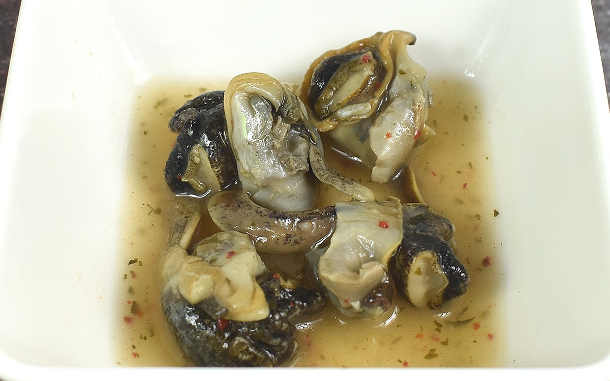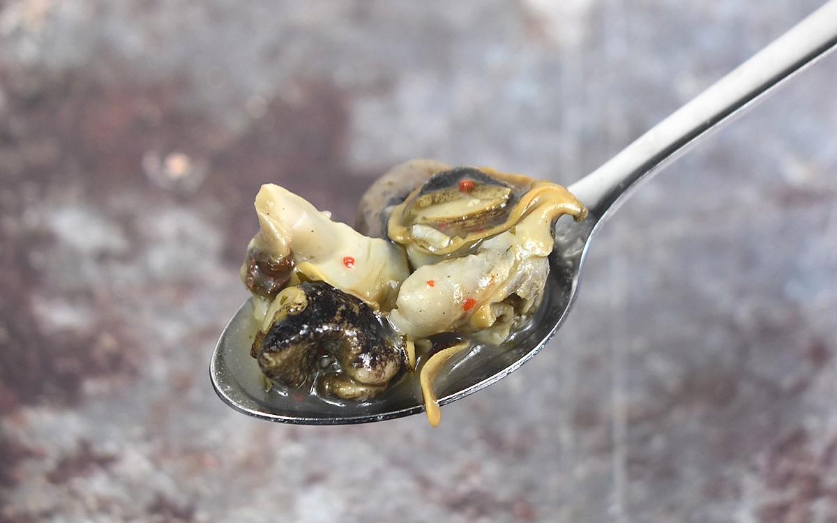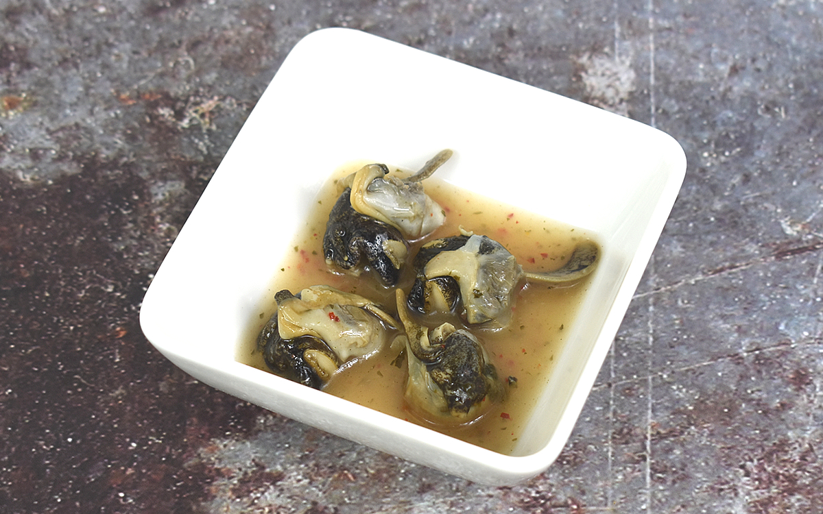 つぶ貝が浸かっているオリーブ油も、にんにくが効いていてGOOD。ピリ辛さと砂糖の甘みがほどよいバランスで混ざっていて、貝をずっと噛んでいても飽きがきません。お酒だけでなく、ご飯やパンと食べてもおいしくいただけます。