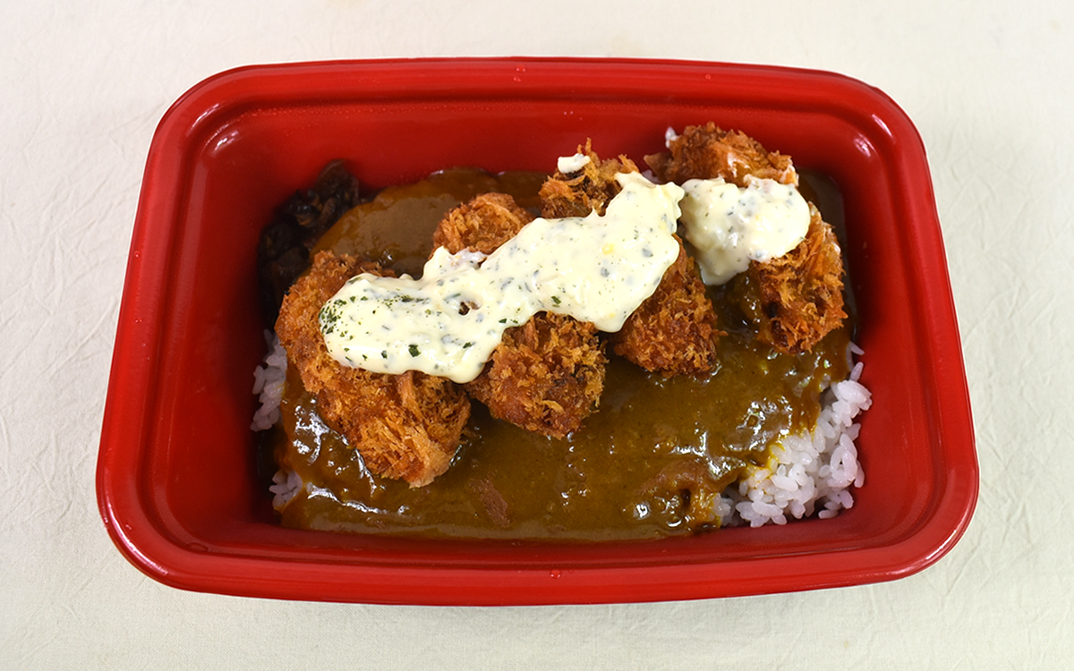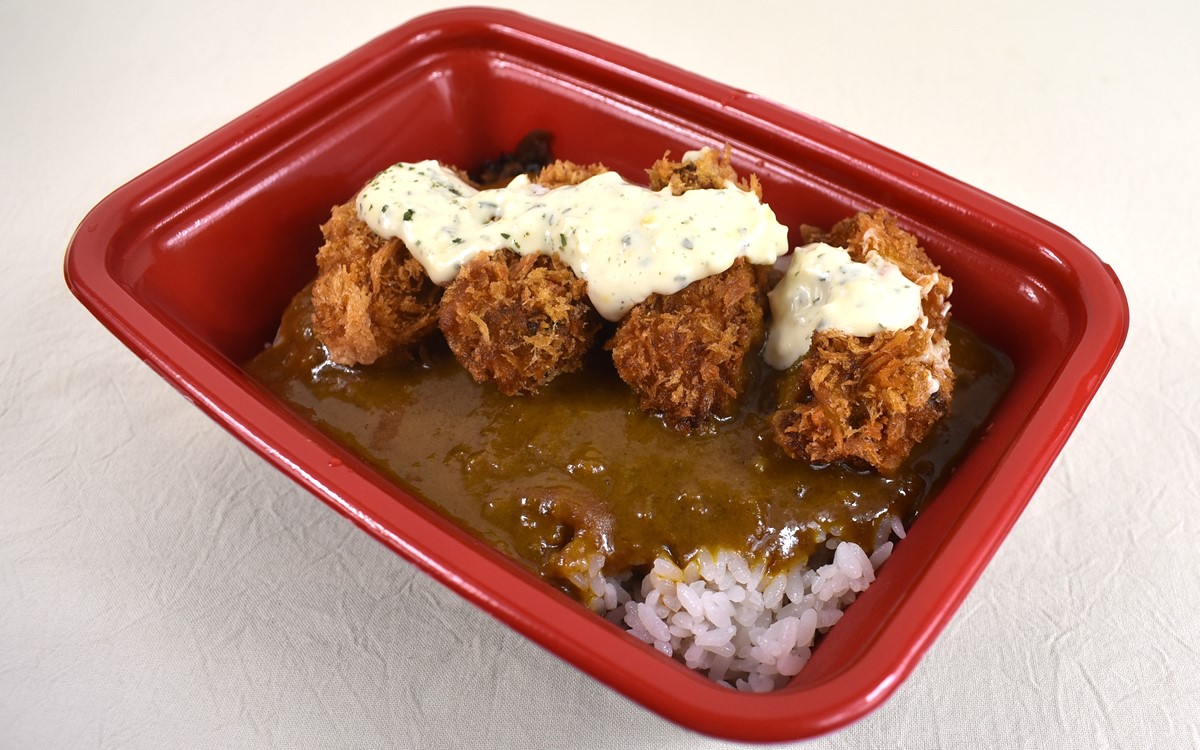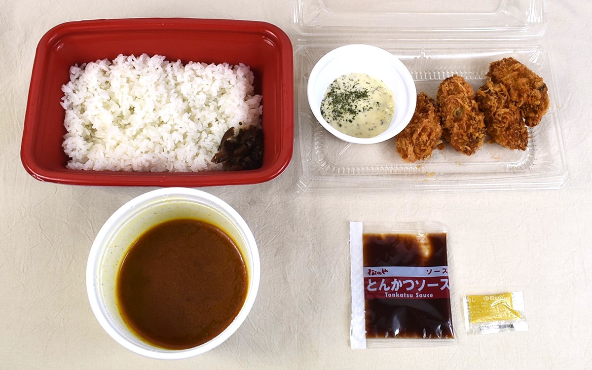 中身を見ていくと、広島県産のカキフライ4個と白飯、ルー、漬けものを確認。別添えでとんかつソースと和からし、タルタルソースが。お好みの調味料を選ぶのも良いですが、それぞれの味を1つずつ楽しむのもアリだと思います。