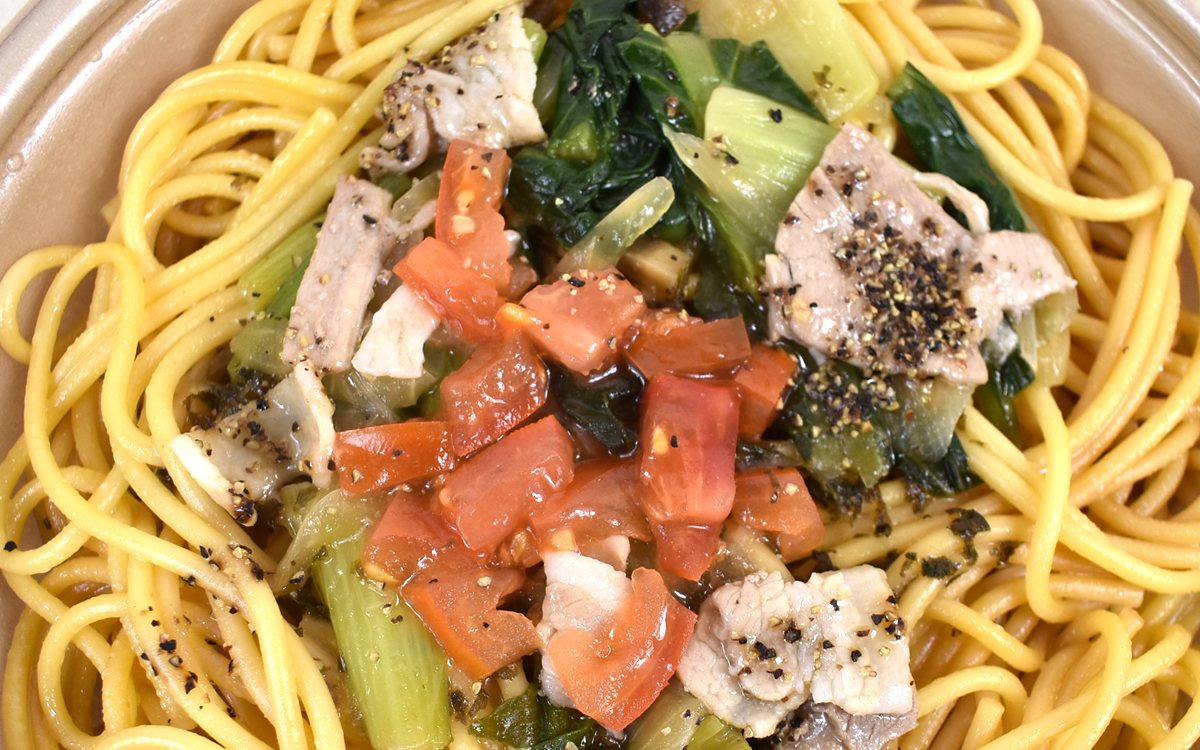 ボリューム&おいしさ満点の「大盛和風パスタ 豚肉と小松菜」。ガッツリ食べたい気分の時は、ぜひ同商品をゲットしてみてくださいね。