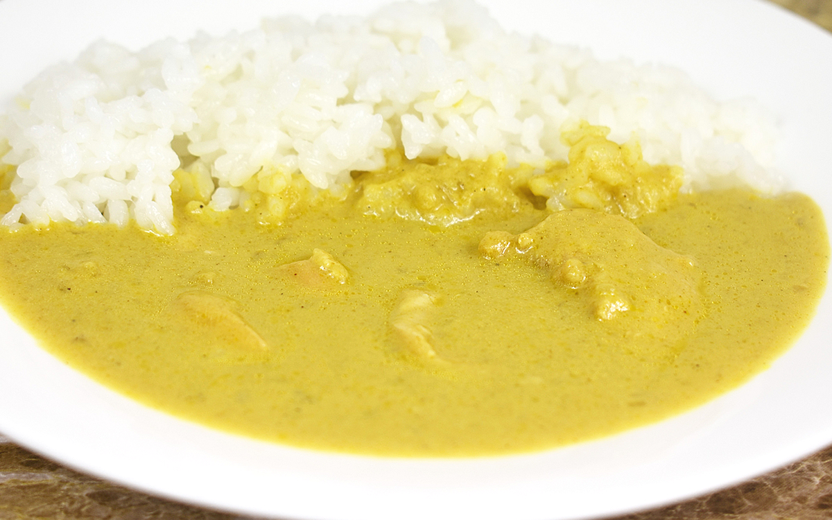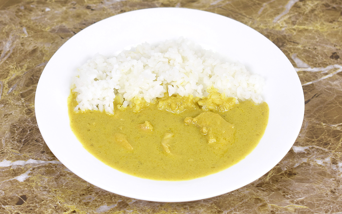 それでは「チキンの豆乳クリームカレー」をいただいていきましょう。加熱は湯せん(5~7分)だけでなく、電子レンジ調理(目安時間 500Wで約2分)でもOK。せっかくなのでご飯も準備してカレーを添えたところ、従来のカレーよりも色が薄いことに驚かされます。
