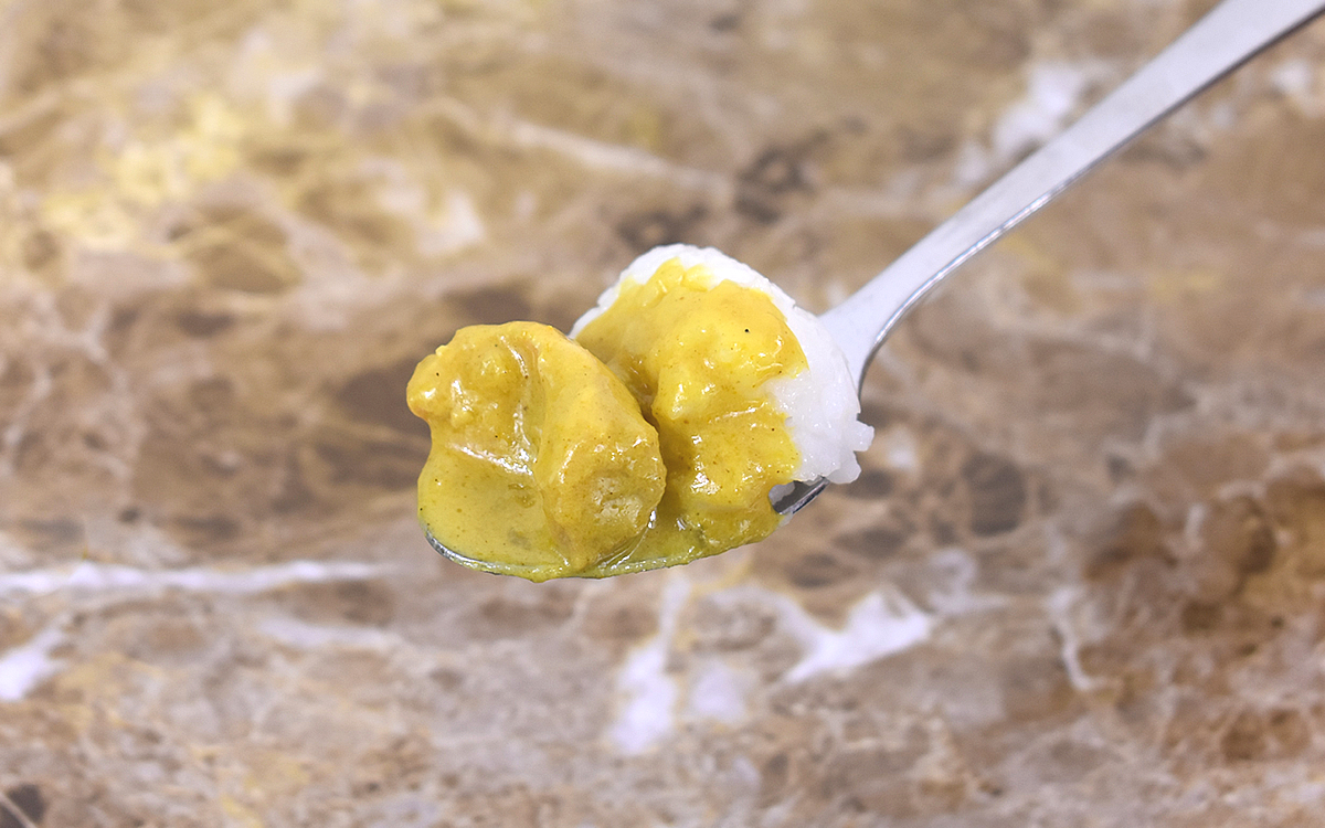 口に運んだカレーは、予想外にまったりとした味わい。実は、かぼちゃととうもろこしのペーストが豆乳とともに使用されていて、野菜の甘みを生かしたカレーに仕上げられているのが同商品の特徴です。もちろんカレーの風味も濃厚で、クリーミーな口あたりがたまりません。
